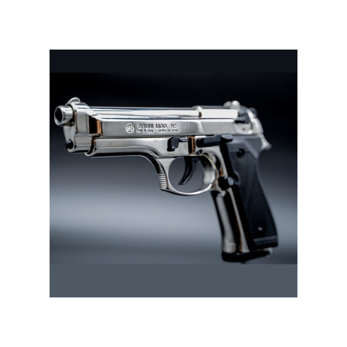 Pistola scarrellante semiautomatica a salve replica perfetta in scala 1a1 modello Beretta 92 Inox, full metal, funzionamento a singola/doppia azione, impugnatura ergonomica antiscivolo con gancio porta correggiolo, caricatore bifilare capacità colpi 15 calibro 8 mm. (il botto e identico a quella reale), sicura bilaterale ambidestra, la camera di scoppio ha un foro laterale di sfiatamento che ne impediscono una eventuale rottura, la pistola viene fornita con valigetta in ABS nera. Le misure corrispondono al modello originale sembra di maneggiare una pistola vera!!. Ottima da collezione, come scacciacani, per i botti di fine anno, ecc. Prodotta in Italia