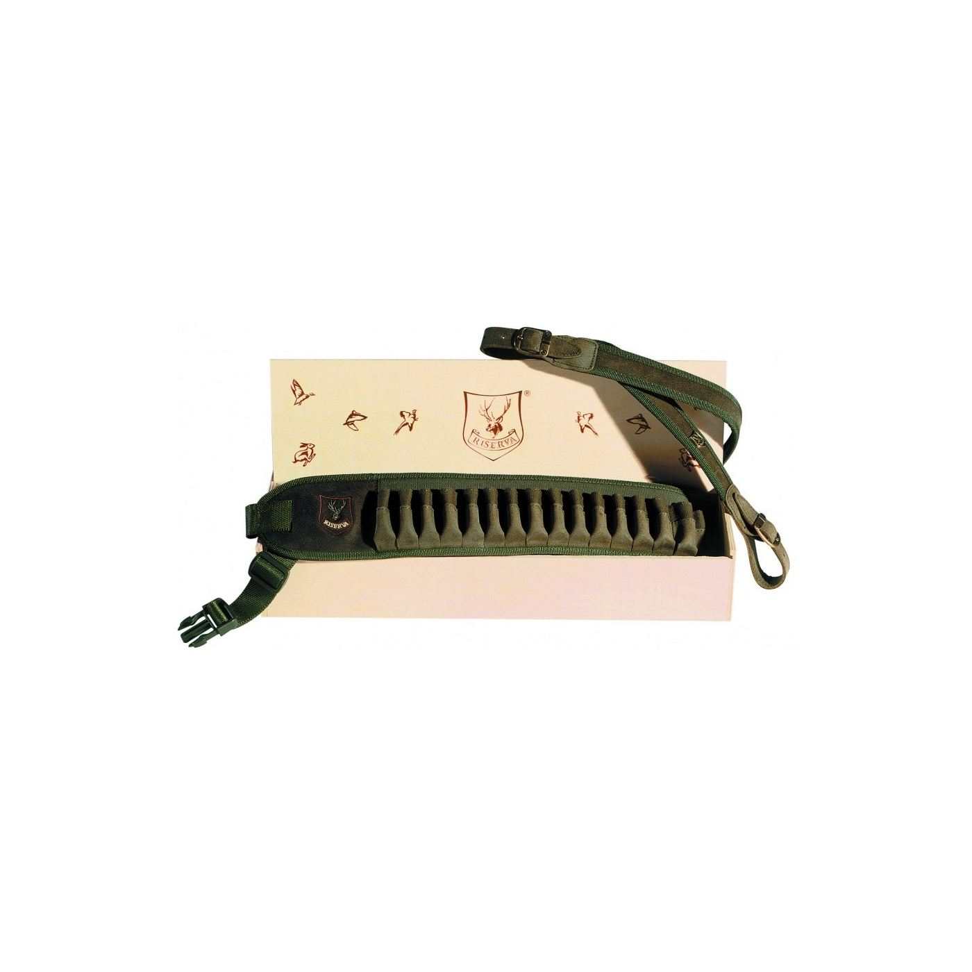 Cartuccera in pelle e cordura da 32 celle calibro 20, con cintura regolabile più tracolla per fucile in cuoio antiscivolo misura 100 Cm il tutto viene proposto in un elegante confezione regalo in legno con logo Riserva marchiato a fuoco.