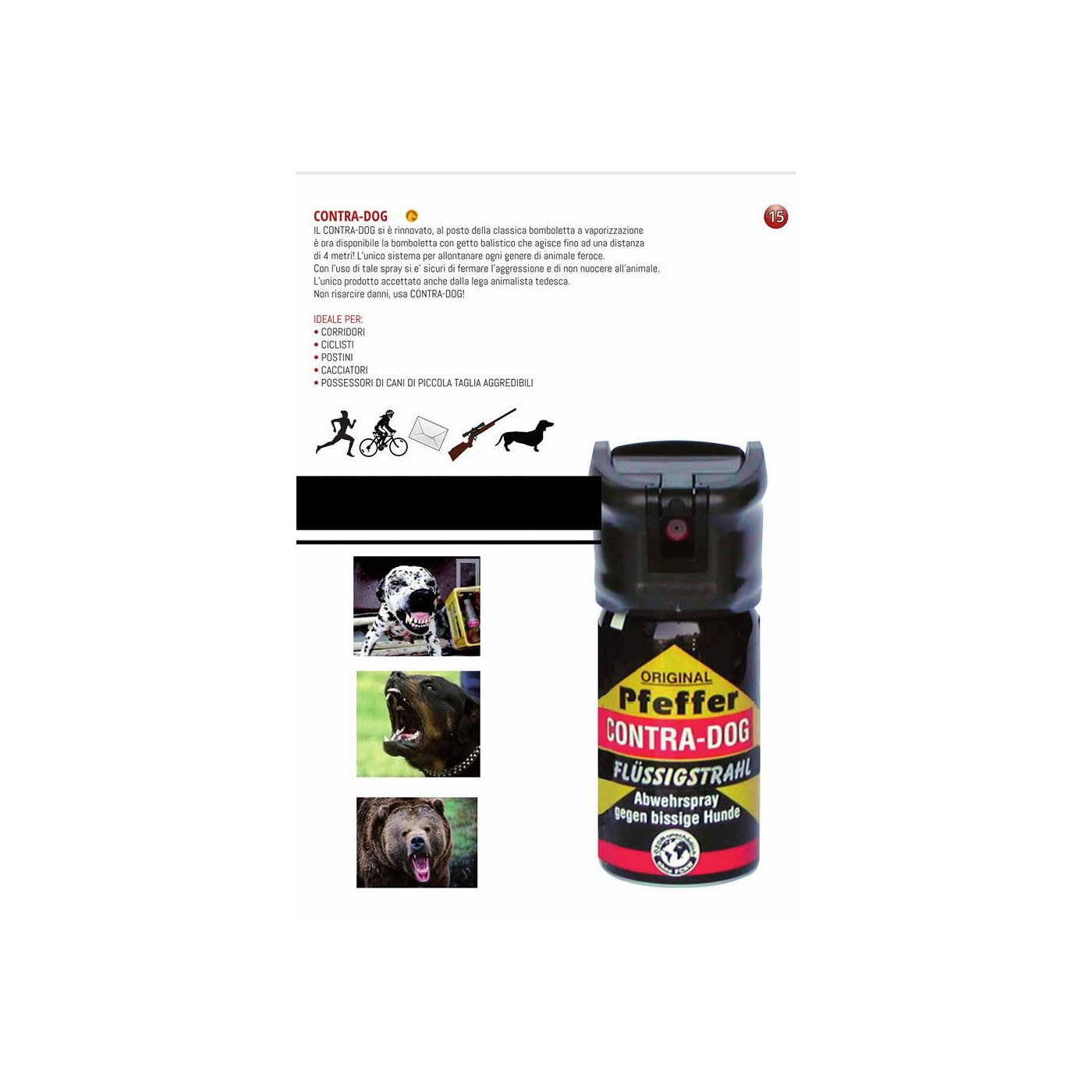 IL CONTRA-DOG si è rinnovato, al posto della classica bomboletta a vaporizzazione è ora disponibile la bomboletta con getto balistico che agisce fino ad una distanza di oltre 4 metri!! E' stato realizzato in questo formato tascabile per la difesa personale o dei propri cari restringendo le misure, rendendolo compatto e di facile utilizzo con 40 spruzzi dosati. Lo spray è di immediato utilizzo grazie ad una sicura auto sbloccante. .Contra Dog è l'unico sistema per allontanare ogni genere di animale feroce o per difendere il proprio cane dalle aggressioni di altri più grandi e feroci ma ottimo anche contro aggressioni umane. Con l’uso di tale spray si è sicuri di fermare l’aggressione, di non nuocere alla bestia colpita dal getto perché il principio attivo urticante è estratto dal peperoncino (Oleo Capsico OC) e crea fastidi alla vista e alle prime vie respiratorie mettendo fuori combattimento per 20-25 min. ma senza lasciare ne lesioni ne conseguenze, infatti è l’unico prodotto accettato anche dalla lega animalista tedesca. E' il prodotto ideale per: corridori, ciclisti, postini, cacciatori, possessori di cani di piccola taglia. Contra Dog è prodotto in Germania dalla DEFENCE SYSTEMS.
