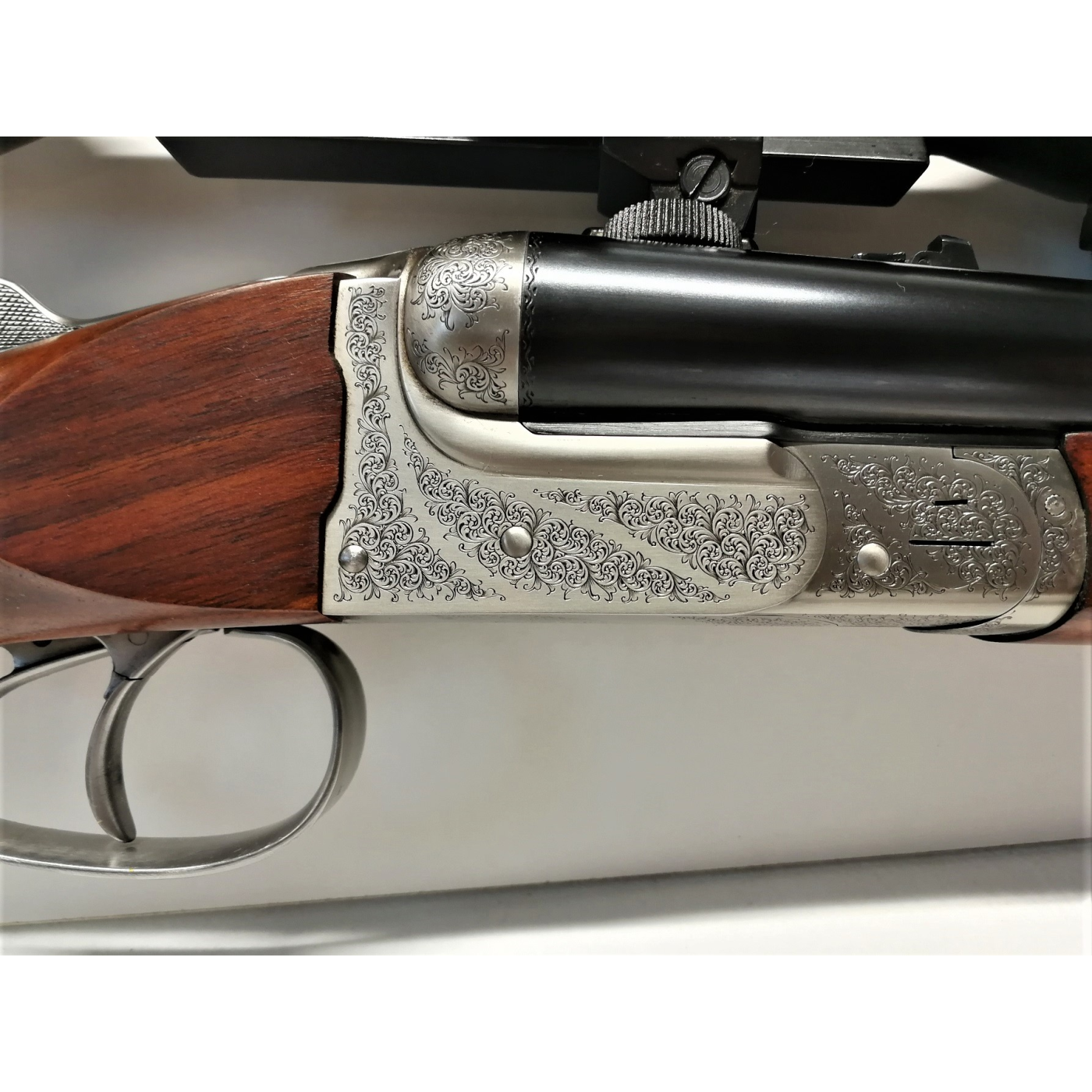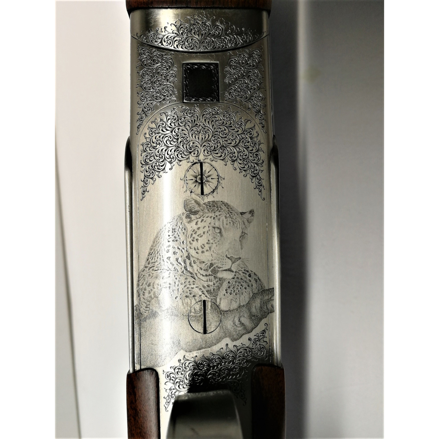 Pedretti era uno dei pochi incisori “completi”: riusciva, infatti, egualmente bene nell’esecuzioni sia dell’inglesina sia dei paesaggi e degli ornati molto elaborati sia nelle varie tecniche di bulino, punta, martello e cesello. La carabina viene venduta nella sua elegante valigetta in pelle con serratura, accompagnata da tutti i certificati come da foto.