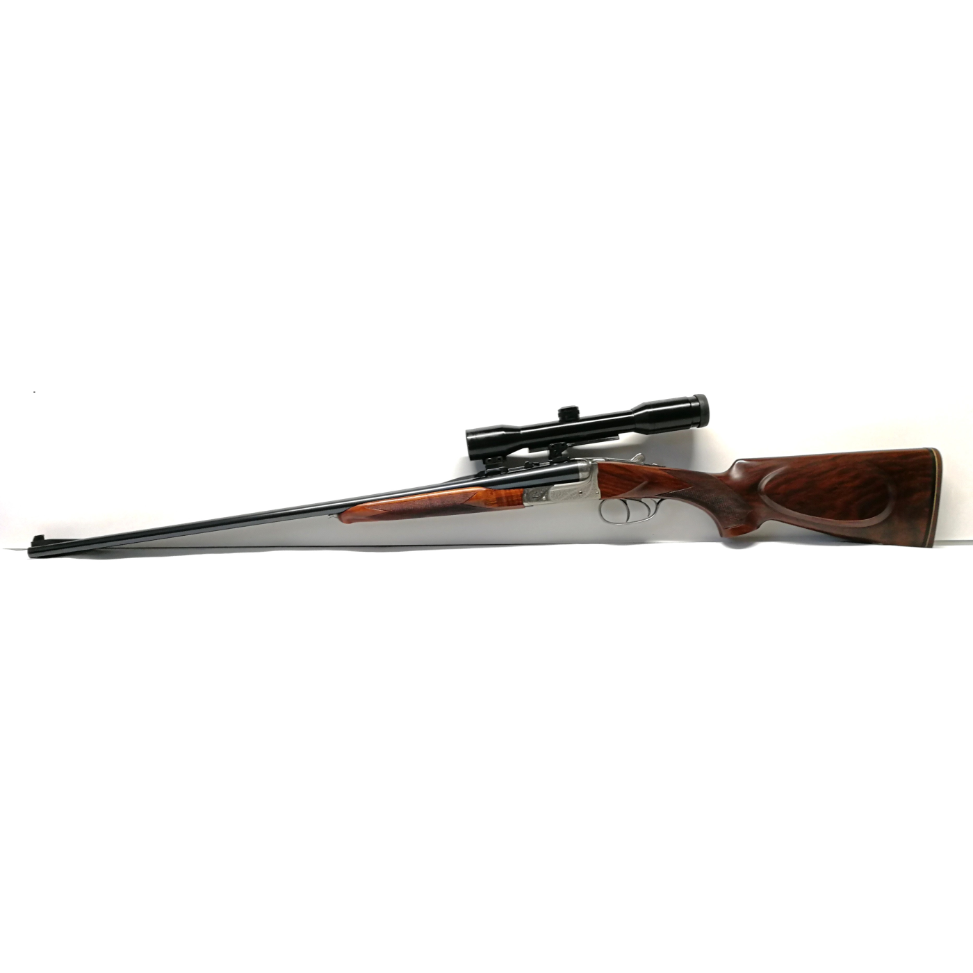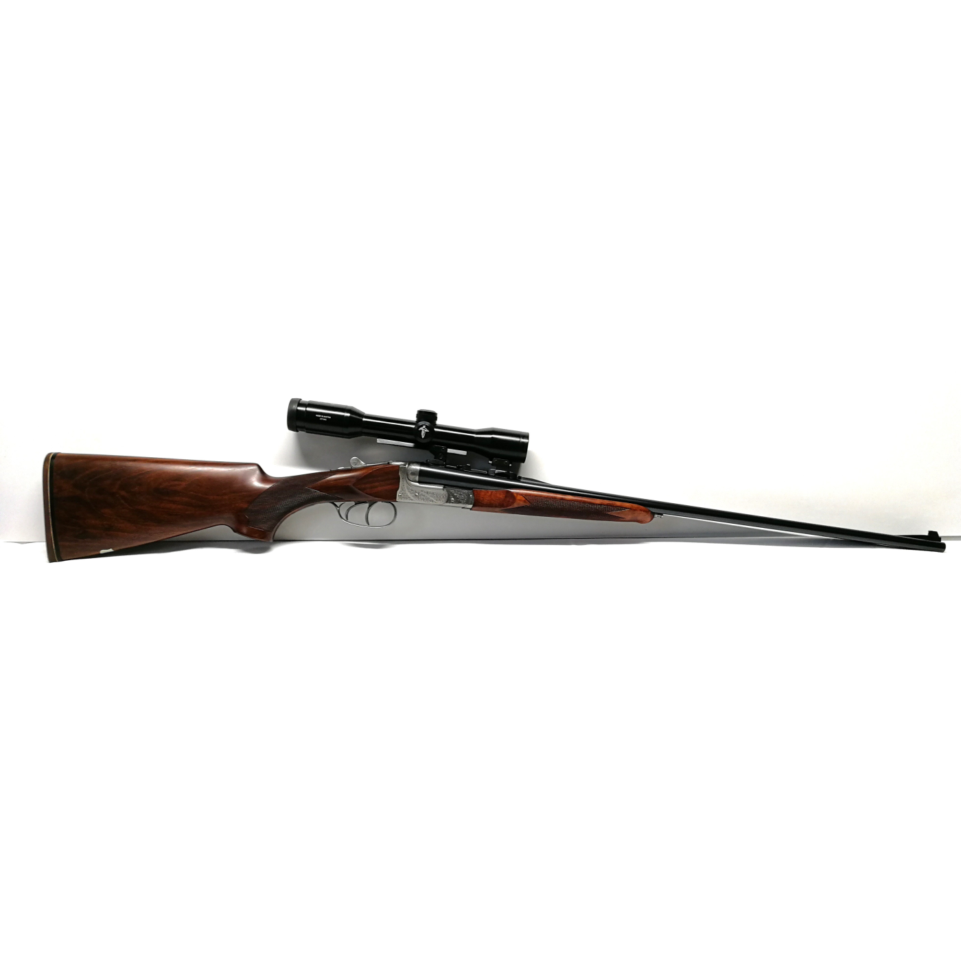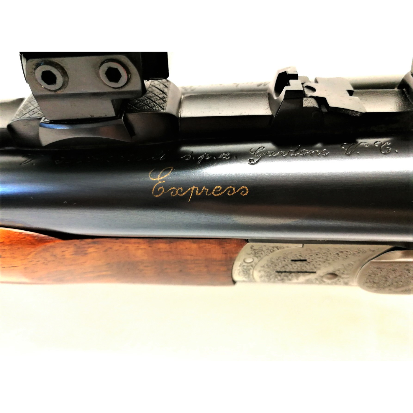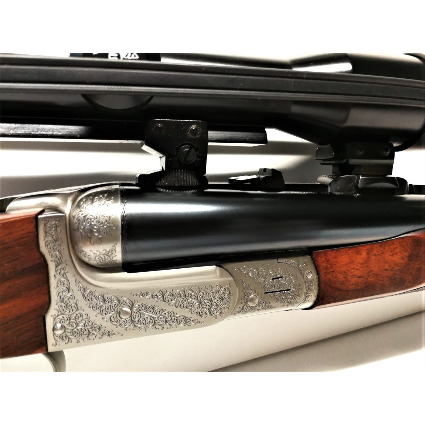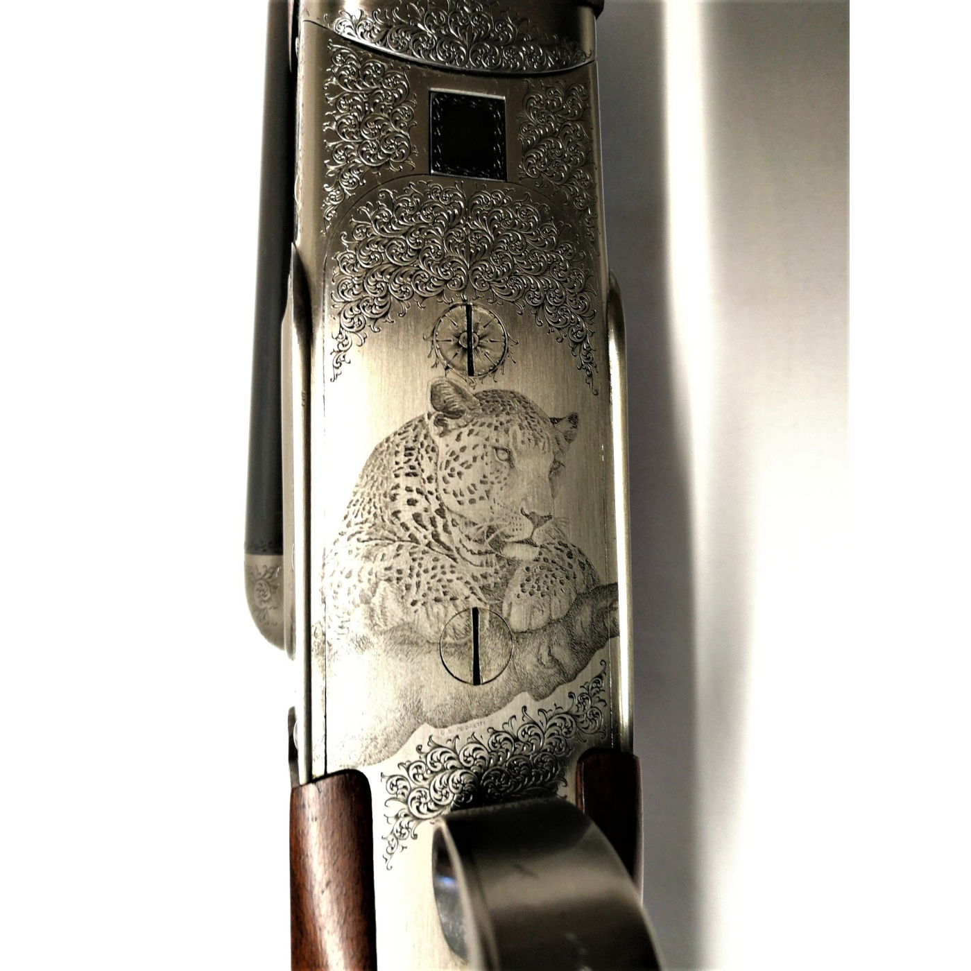 Arma Nuova Fucile di prestigio Vincenzo Bernardelli modello Express VB calibro 9,3x74 R con attacchi a sgancio rapido e cannocchiale Swaroski Habicht 4x32 Nova. La particolarità di quest' arma è data dall' elegante incisione a mano della Bottega incisioni del maestro Giancarlo Pedretti, rappresentata da un ghepardo a riposo dopo la cacciagione