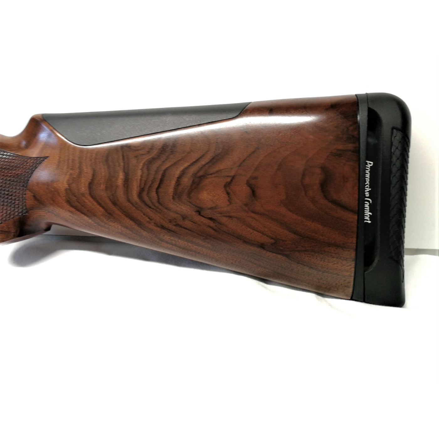 Legni: asta e calcio tipo caccia; calcio lungo 365mm, piega (montata) 55mm, deviazione (montata) 6mm dx; impugnatura a pistola e calciolo Progressive comfort; zigrinatura al laser