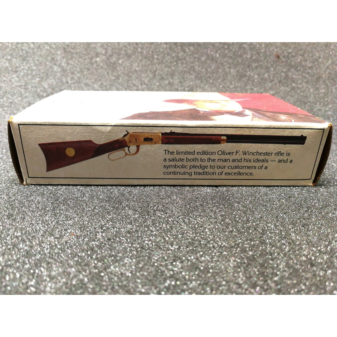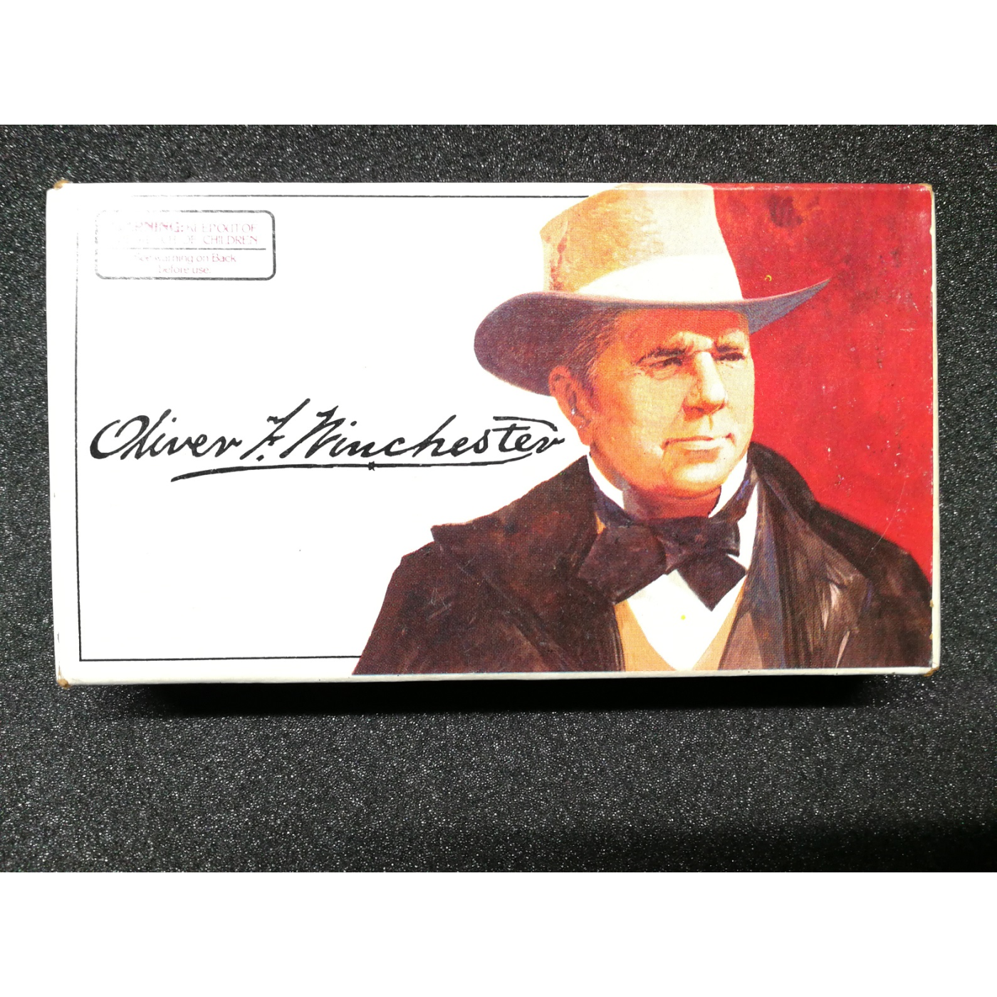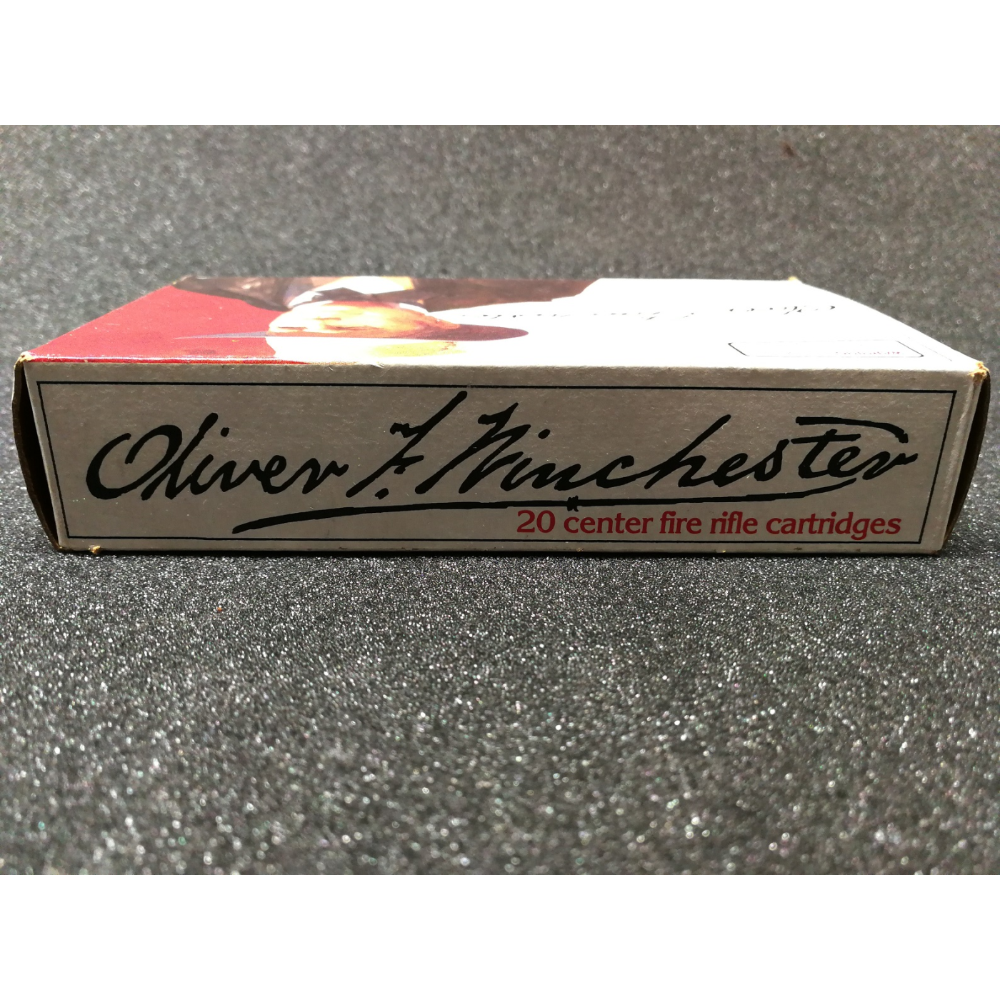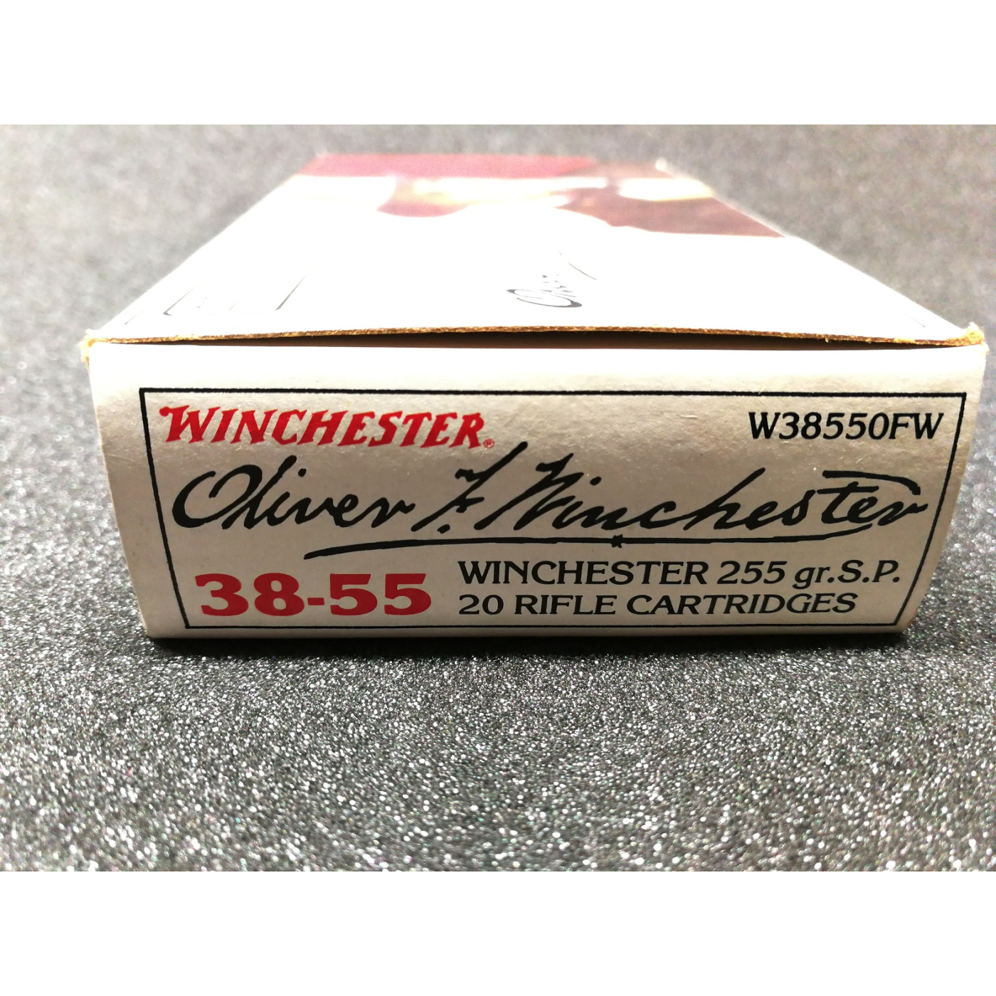 Una scatola completa da 20 colpi di Winchester-Western 38-55 da 255 gr. soft point. La scatola mostra l'immagine di Oliver Winchester con firme facsimile e l'immagine del fucile commemorativo sul pannello laterale. Le cartucce sono ben conservate e la scatola è quasi perfetta e presenta una leggera usura da conservazione.