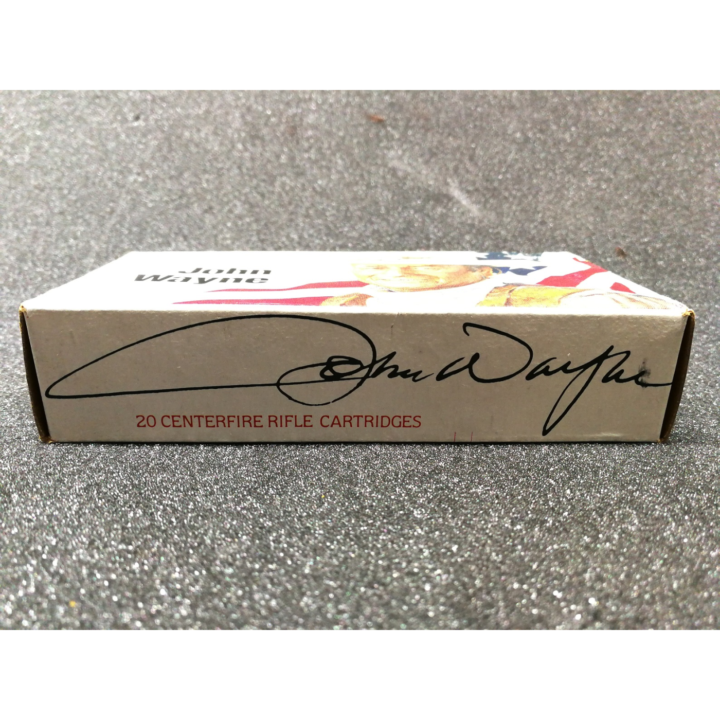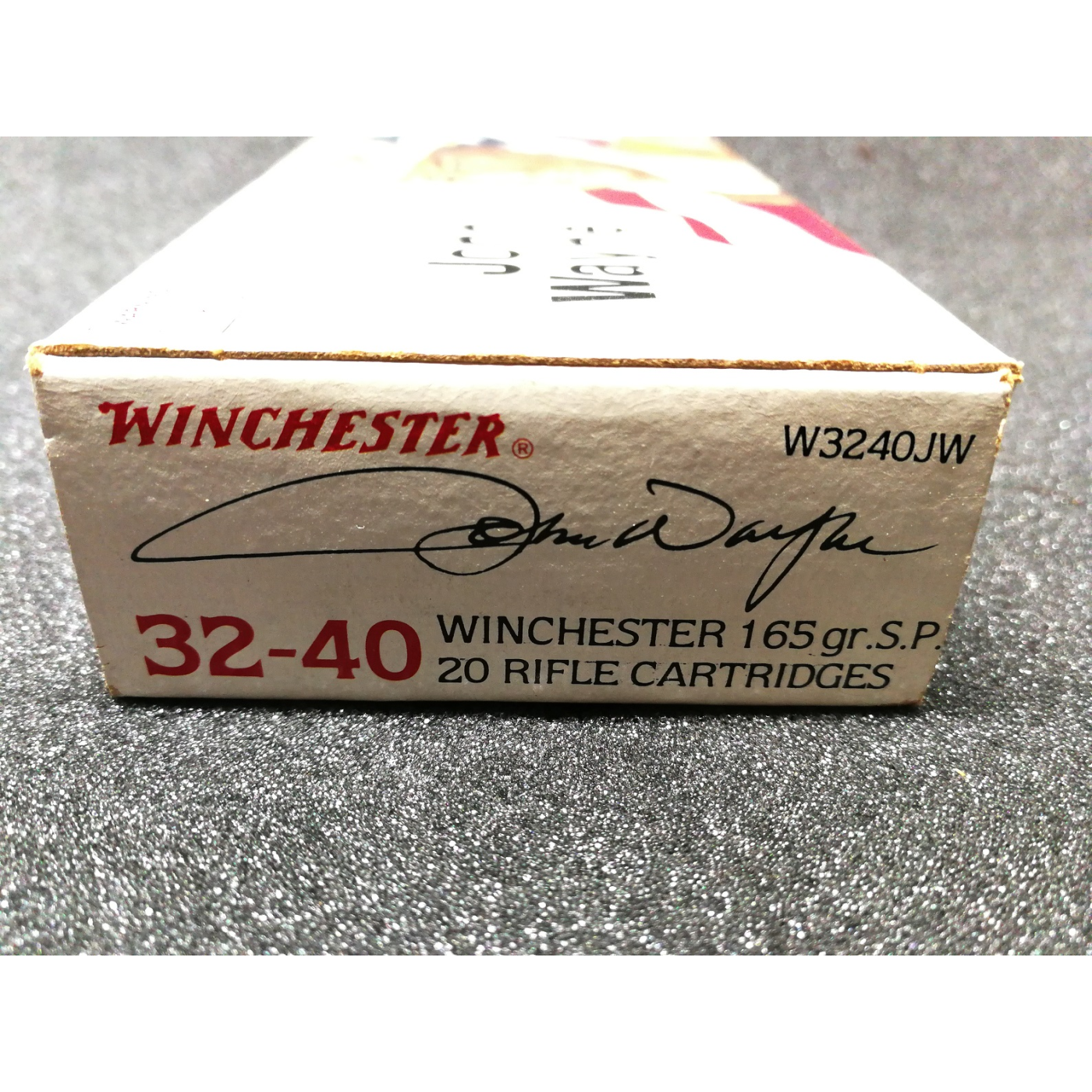 Una scatola completa da 20 colpi di Winchester-Western 32-40 da 165 gr. soft point. La scatola mostra l'immagine di John Wayne - con firme facsimile e sui pannelli laterali. Le cartucce sono ben conservate e la scatola è quasi perfetta, presenta una leggera usura da conservazione.