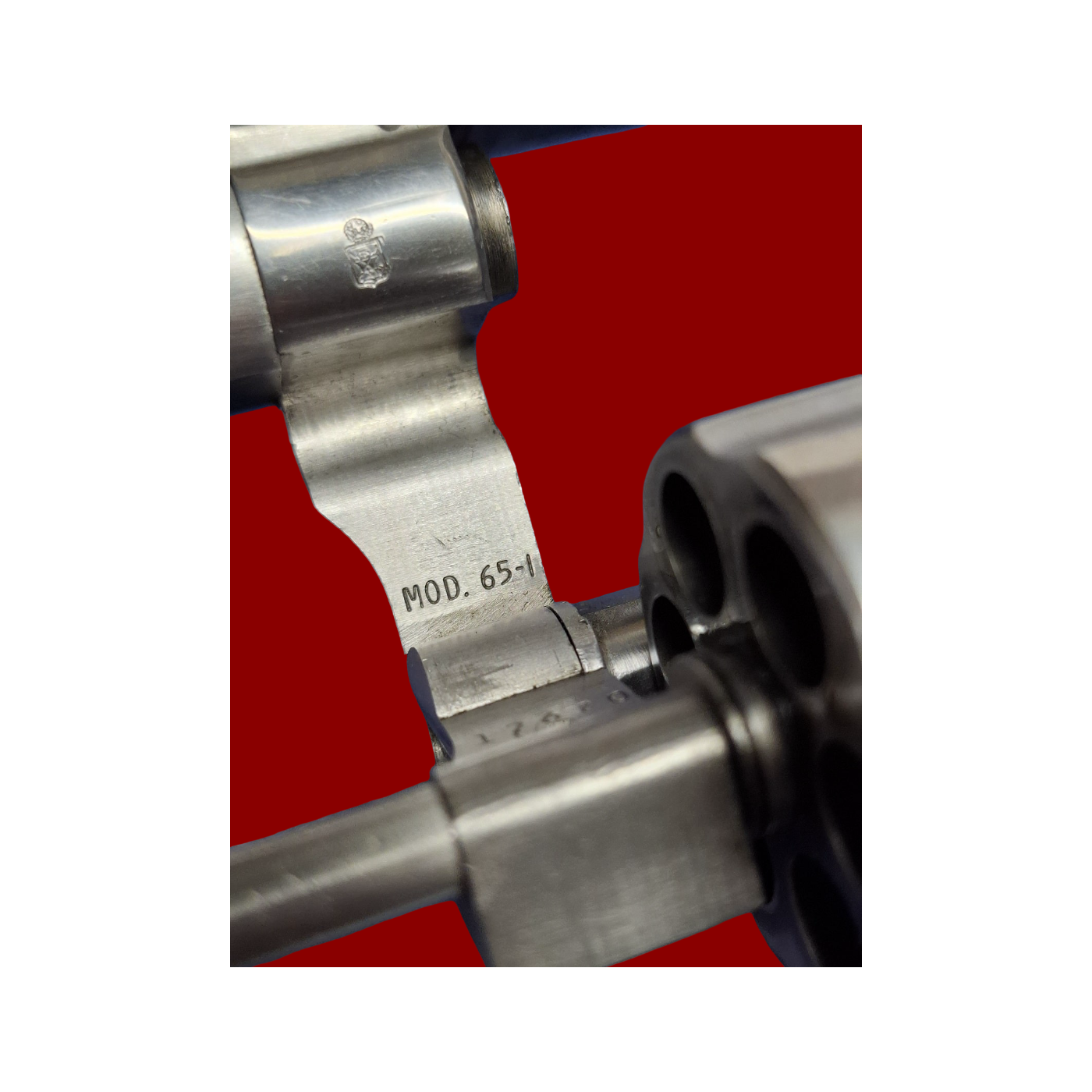 Revolver Smith & Wesson modello 65-1 calibro 357 Magnum. Questo modello è stato per circa 20 anni in dotazione alle forze dell'ordine americane, apprezzato in tutto il mondo per la sua precisione e bellezza. Arma totalmente realizzata in acciaio inox, con canna spinata pesante da 4” Heavy Barrel, tamburo a 6 colpi con counterboring - guance anatomiche in morbida gomma. Anno 1978