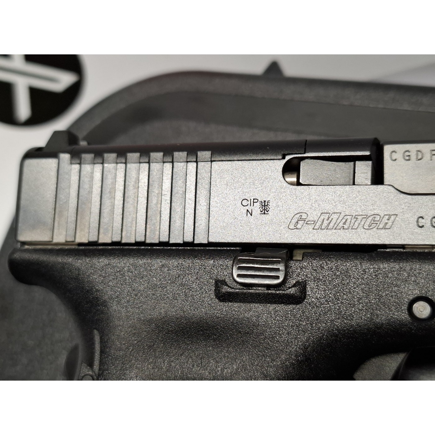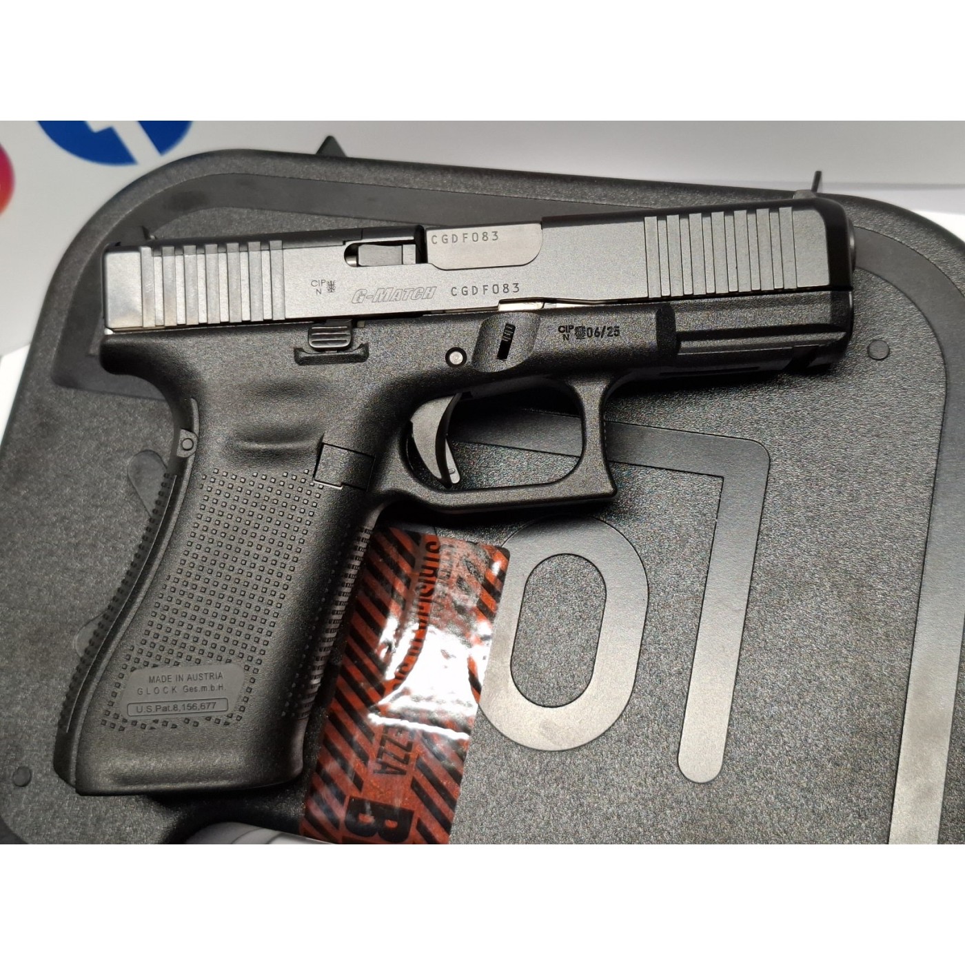 La nuova GLOCK 45 G-Match MOS è una Gen5 e come tutta questa generazione, ha rimosso le scanalature delle dita sulla parte anteriore del fusto per una maggiore versatilità, ma consente comunque di personalizzare facilmente la presa utilizzando i diversi dorsalini posteriori. Il carrello ha l'eccellente finitura dura DLC in nero antiriflesso e di serie ha gli intagli di presa anteriori (FS), offrendo all'operatore una trazione sicura del carrello anche con la mano bagnata o sudata. L’ imboccatura del caricatore sul fusto è stata svasata per una maggiore velocità durante il cambio di caricatore. Lo sgancio del caricatore è reversibile e la leva di sblocco del carrello è ambidestra. Ogni GLOCK 45 ha una canna Marksman Barrel (GMB) di grado match che offre una maggiore precisione con rigatura poligonale migliorata. Anche lo scatto è stato migliorato grazie alla molla di sgancio dello scatto. Versione con sistema MOS (Modular Optic System) che permette di montare un punto rosso sul carrello senza dover rimuovere le tacche di mira.