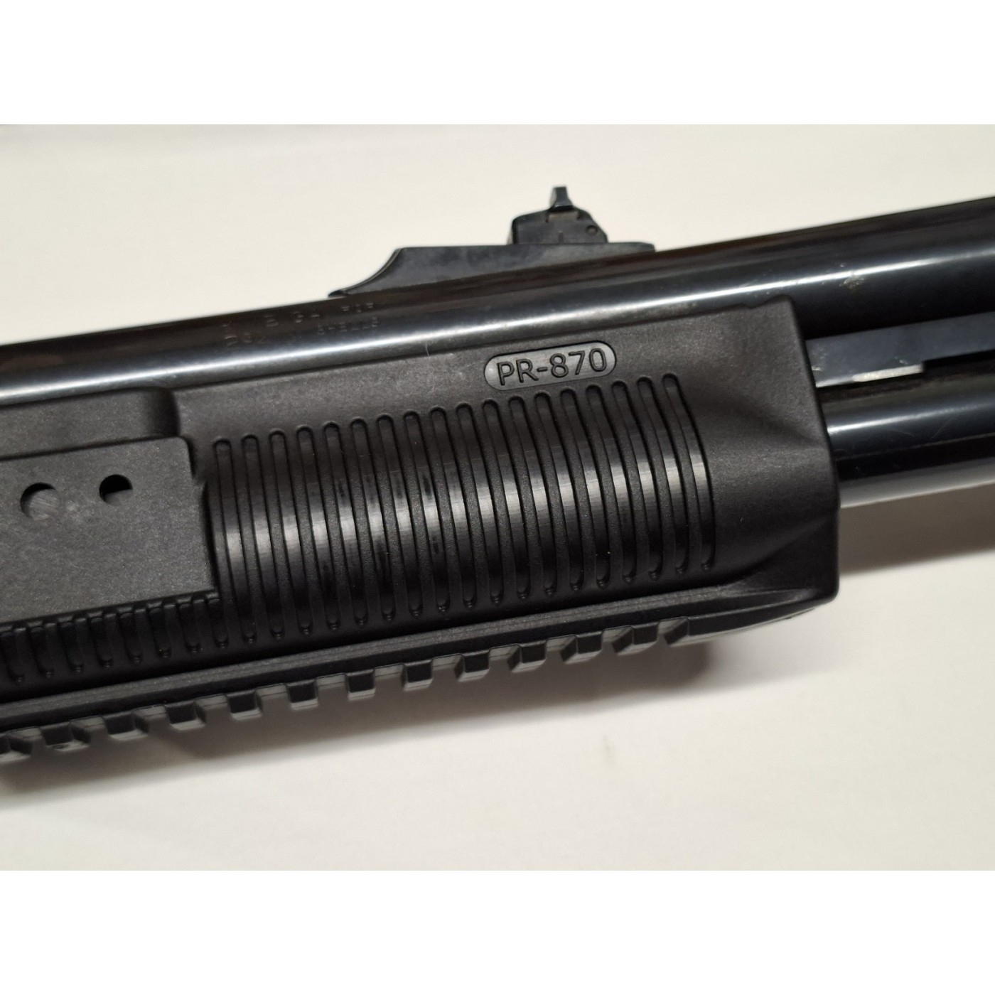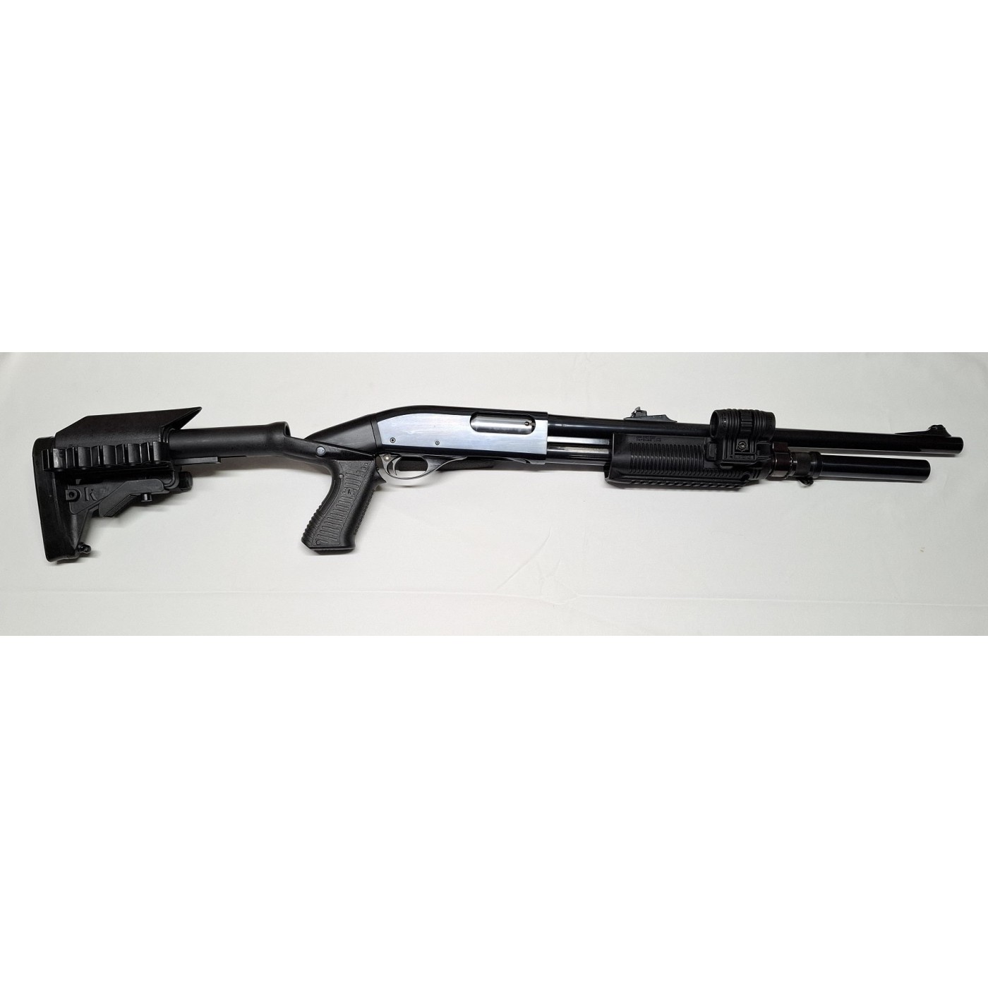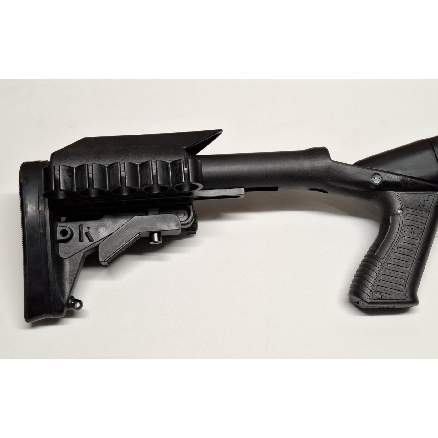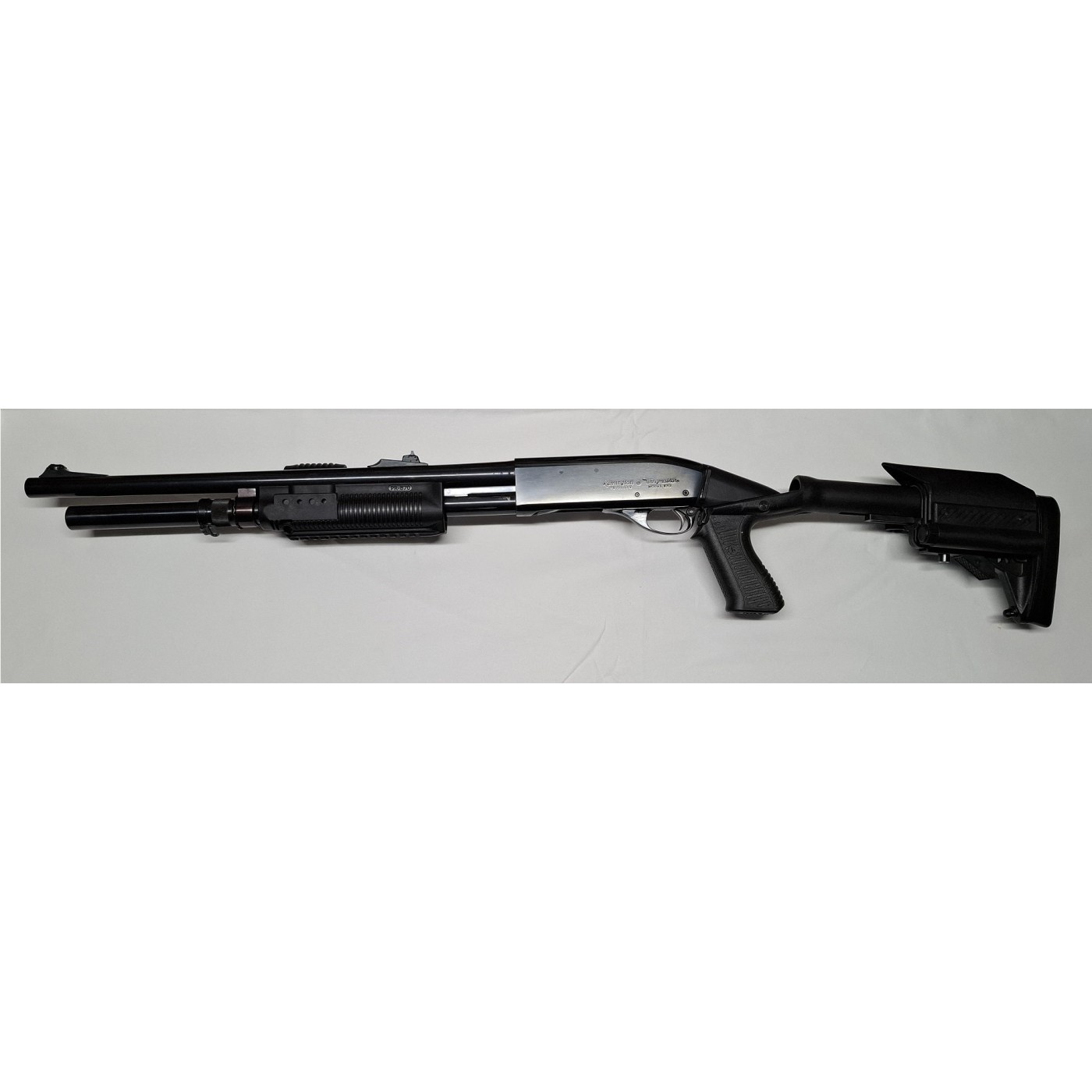 Fucile a pompa Remington modello 870 WingMaster – canna Slug lunghezza 50 Cm – in configurazione FAB Defense – calcio collassabile a pistola in 4 posizioni con cela porta 5 munizioni – asta d’armamento con basetta picattiny sotto e predisposizione per il montaggio laterale di una torcia – tacca di mira regolabile – mirino amovibile. L’arma viene fornita con la calciatura originale in legno e fodero imbottito per il trasporto e cinghia in cordura.