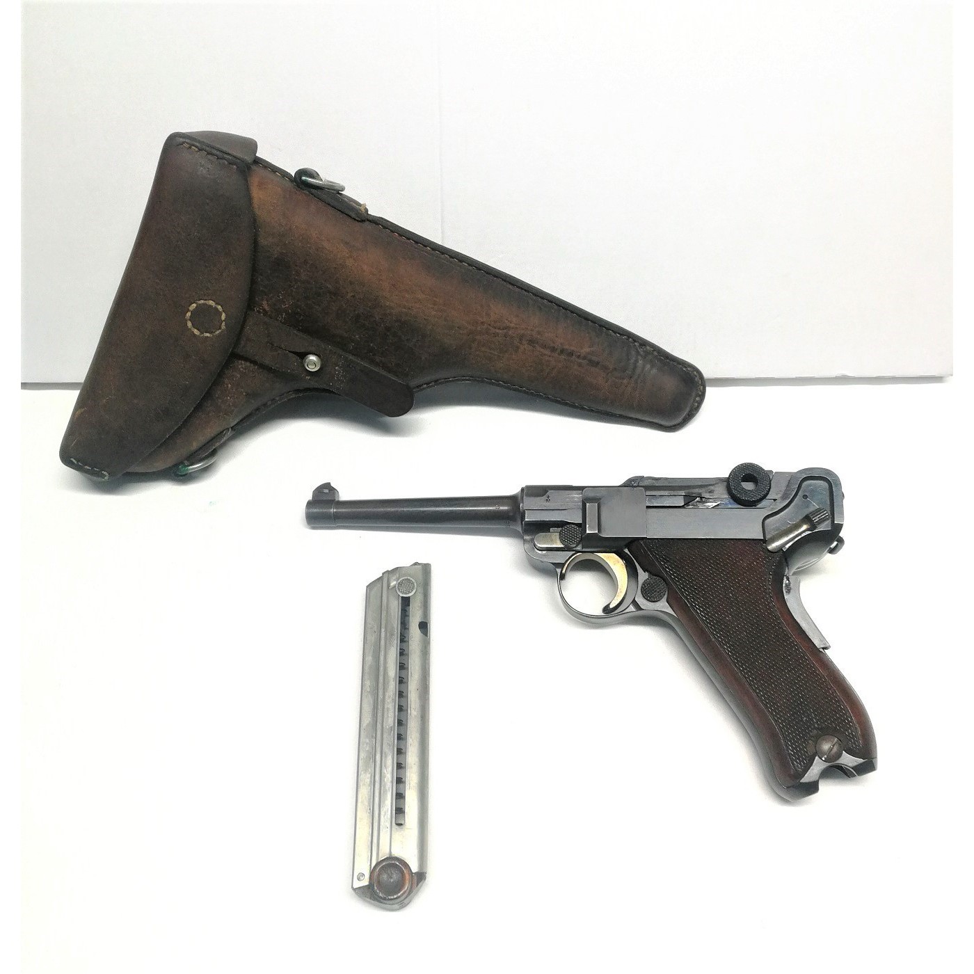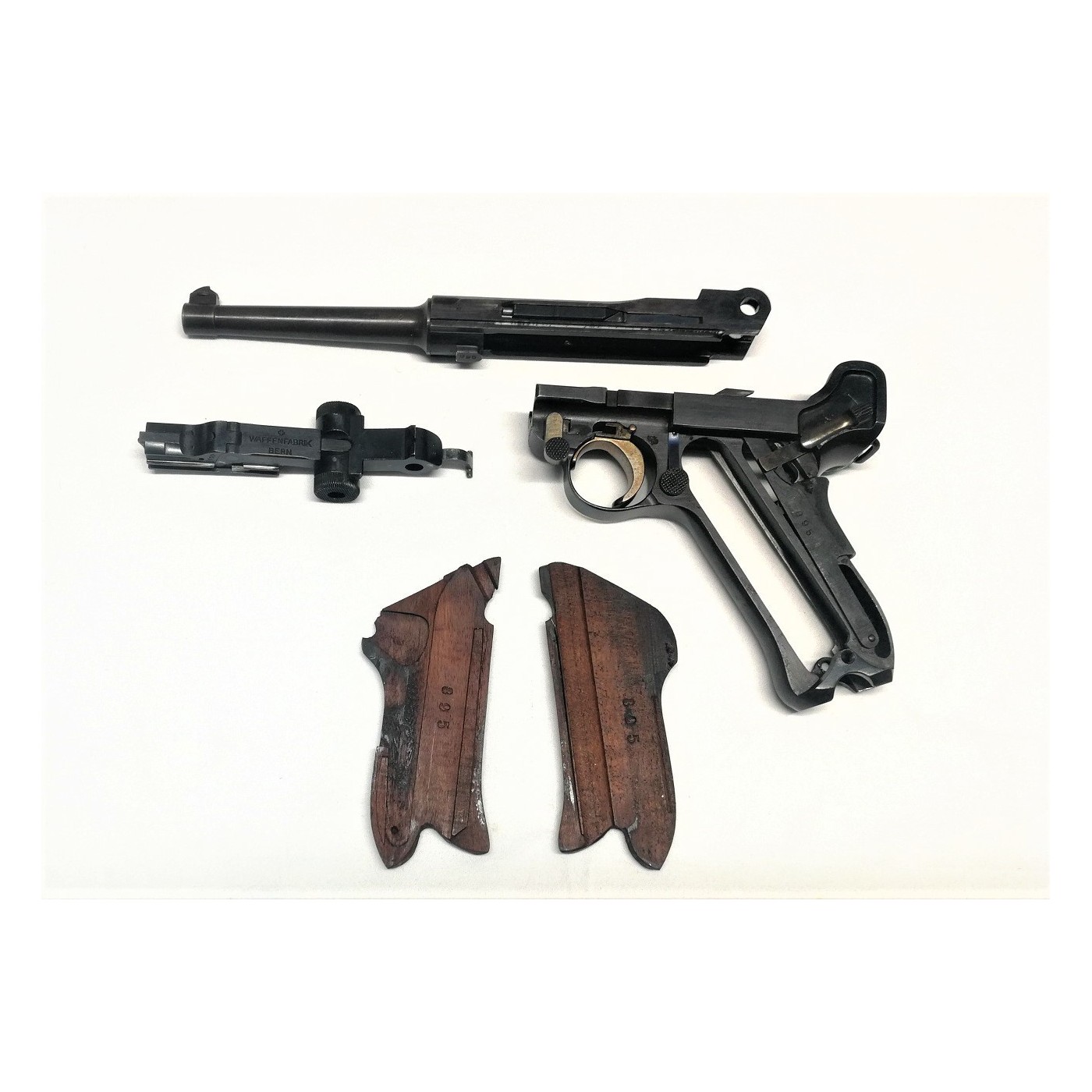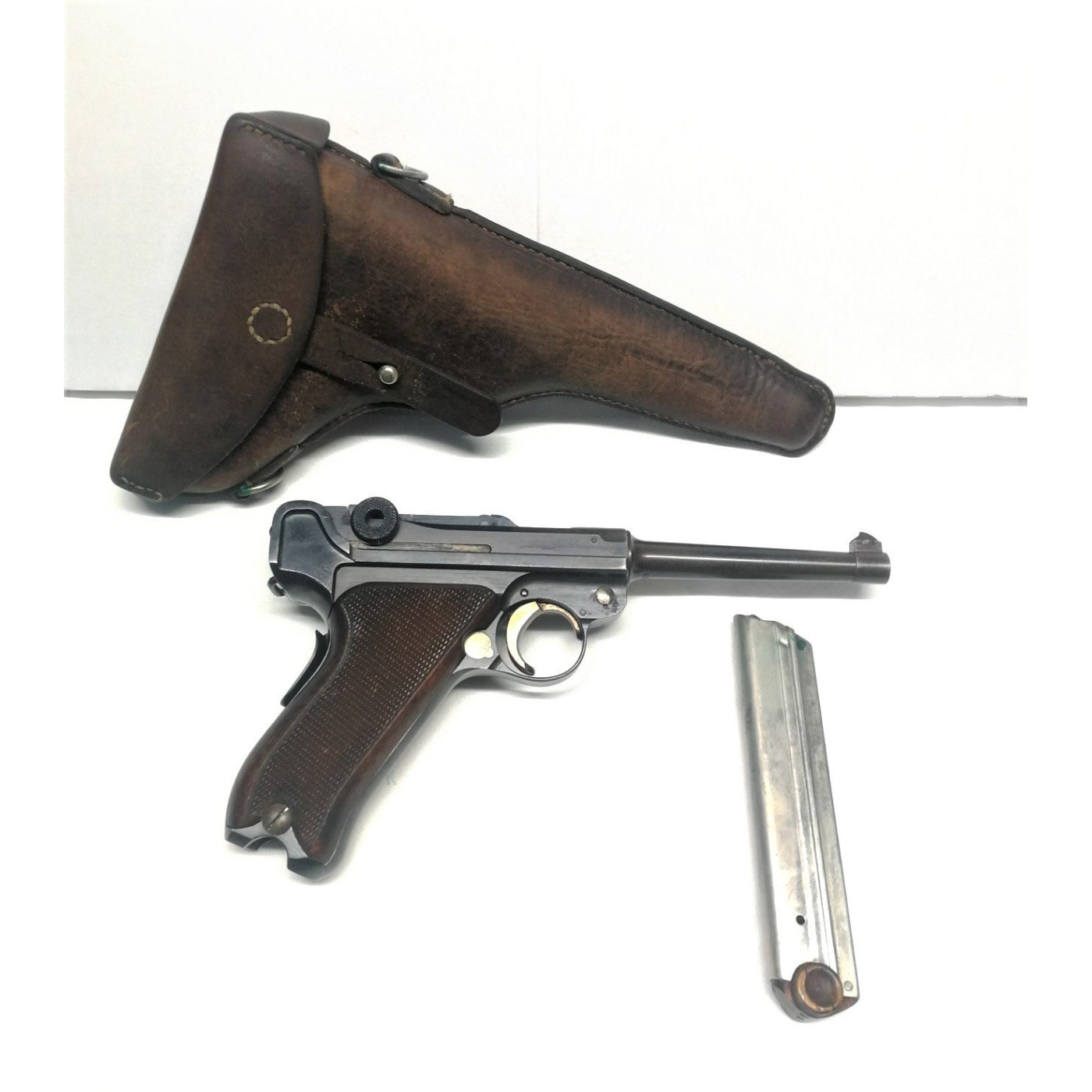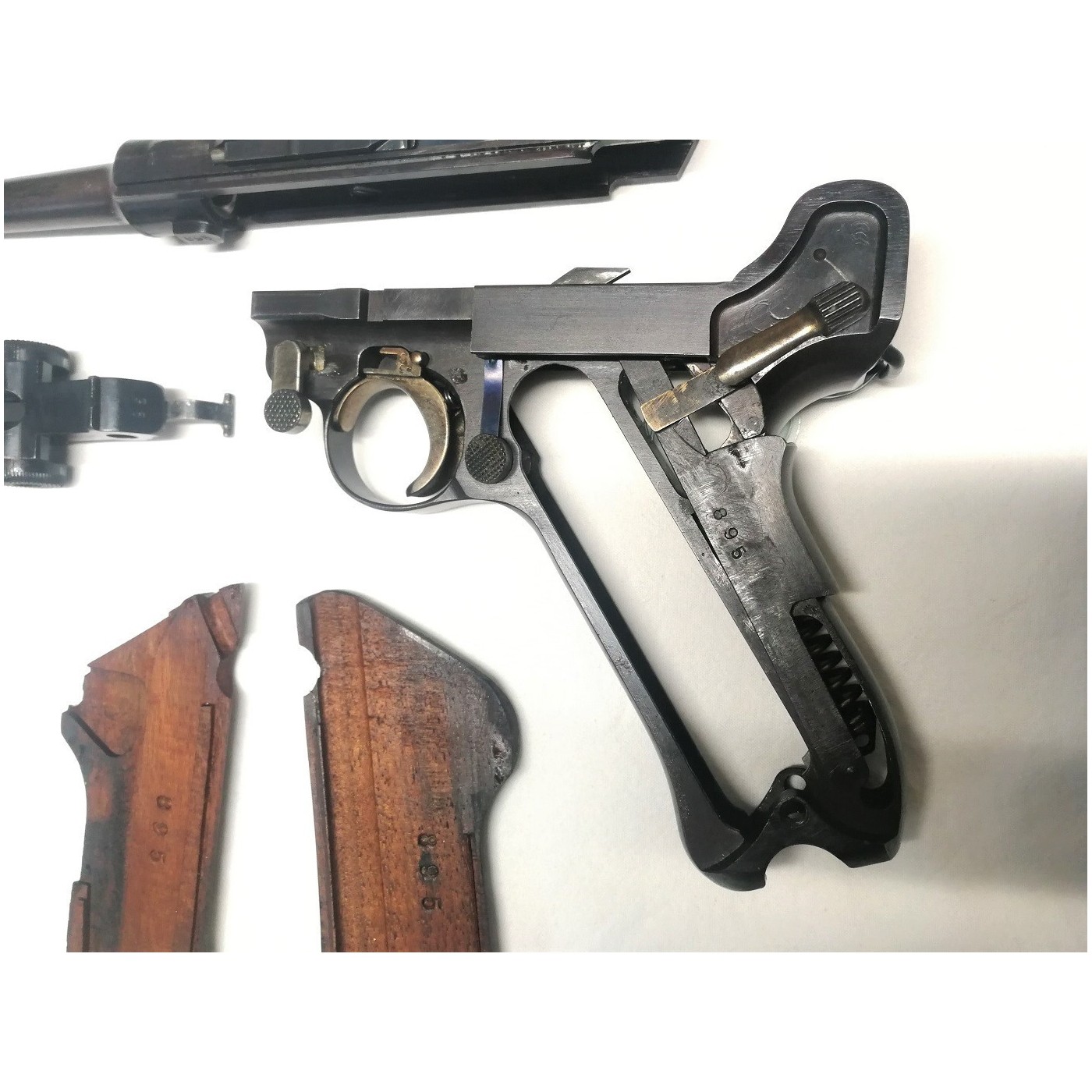 - calibro 7,65 Parabellum - guancette originali in legno - monomatricola - punzone di accettazione tipo militare - corredata dal suo caricatore con fondello in legno matricolato 95 come l'arma. Fondina originale in cuoio marchiata (A. Jenni Bern 15)