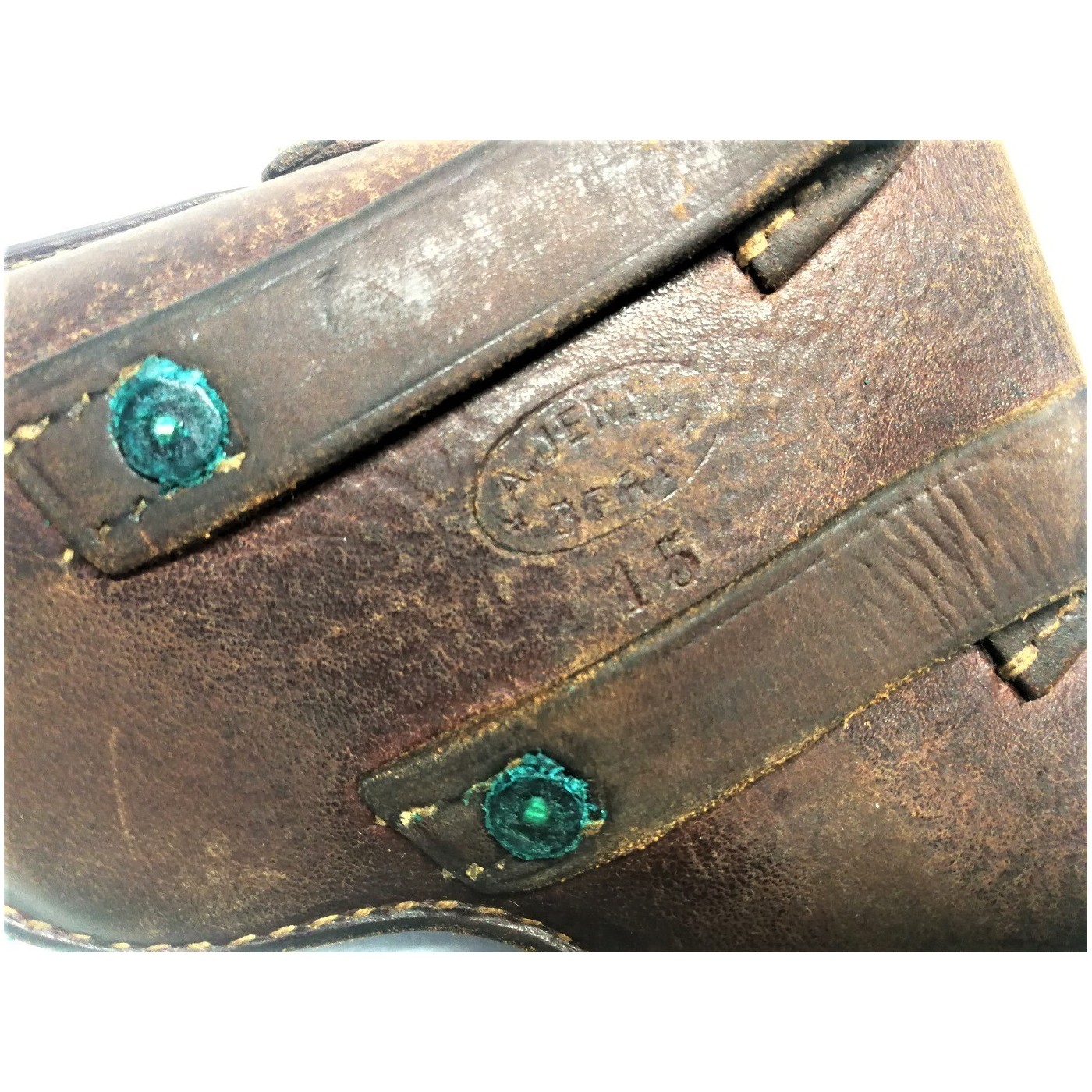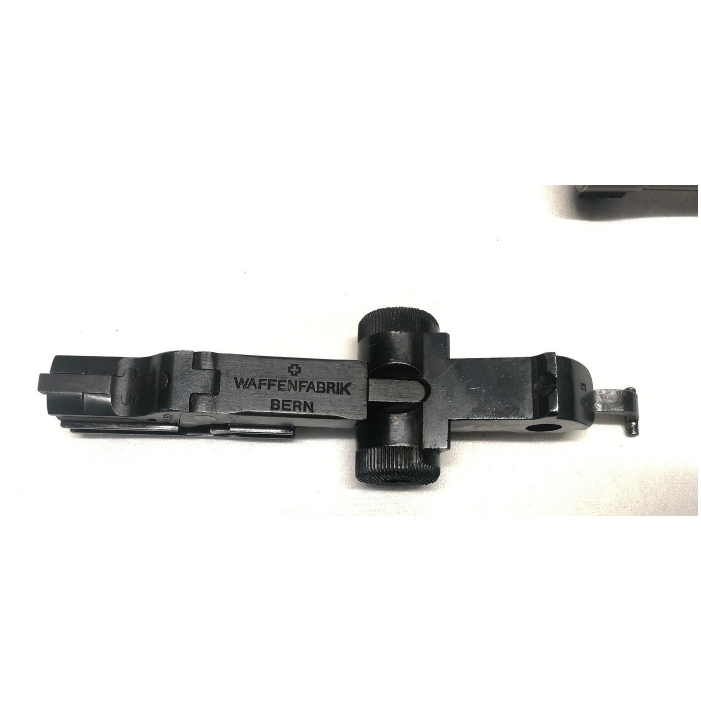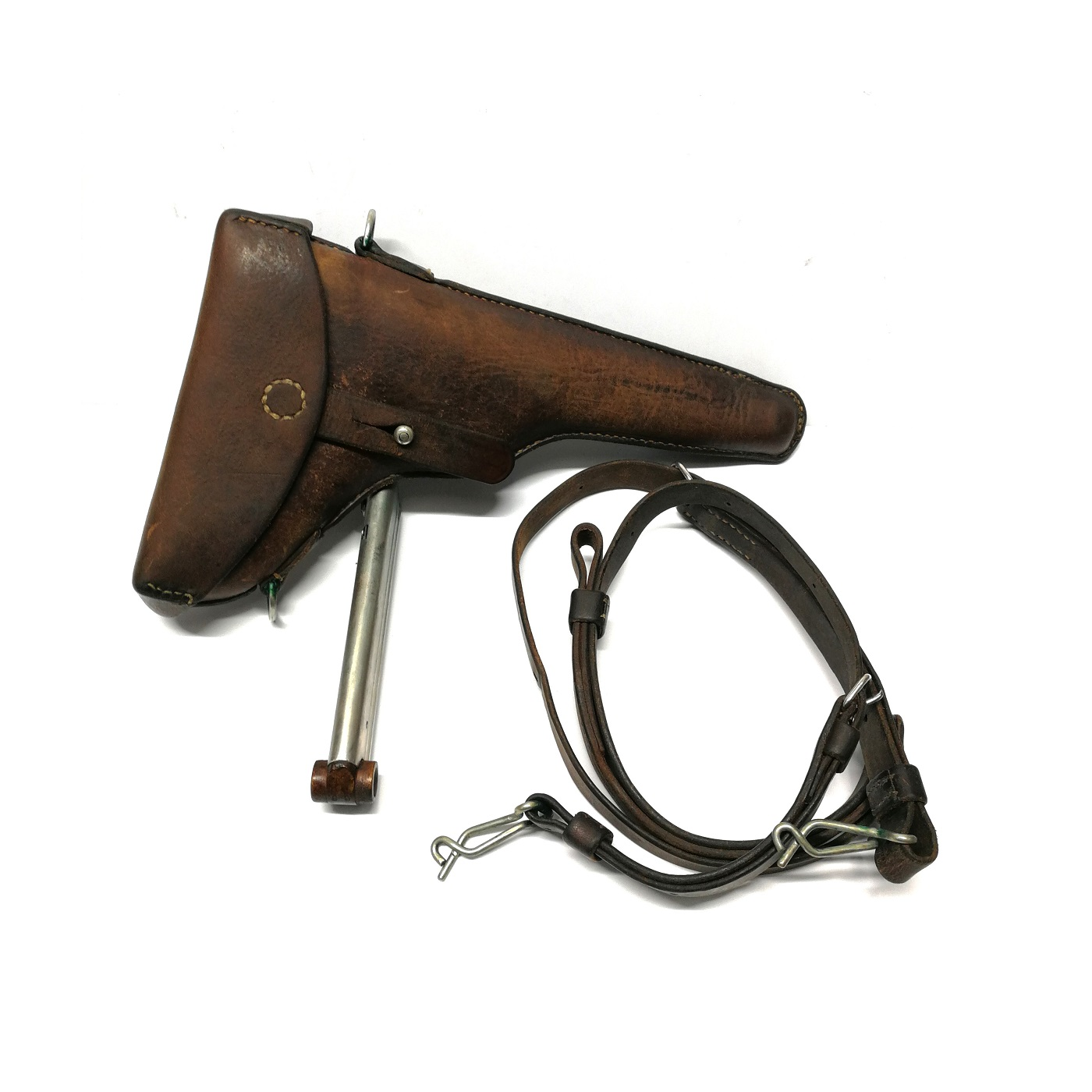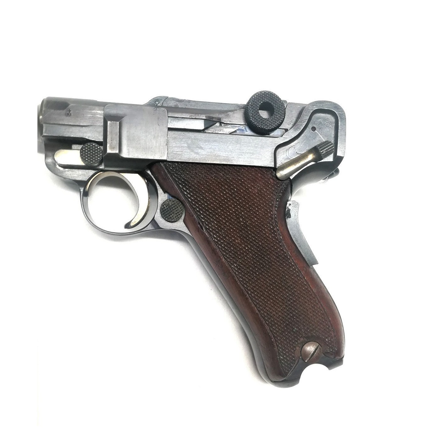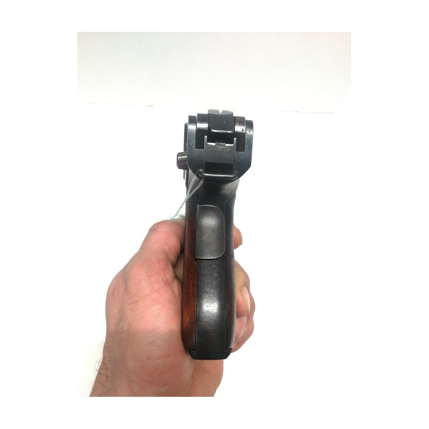 - calibro 7,65 Parabellum - guancette originali in legno - monomatricola - punzone di accettazione tipo militare - corredata dal suo caricatore con fondello in legno matricolato 95 come l'arma. Fondina originale in cuoio marchiata (A. Jenni Bern 15)
