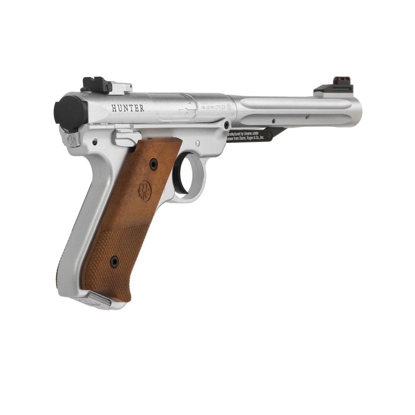 La Mark IV è una replica autentica dell'omonima pistola .22 di Ruger. Il sistema in metallo di alta qualità è decorato con i segni originali e, insieme al mirino in fibra ottica, gli conferisce l'aspetto autentico che i fan dell'iconica pistola a percussione anulare apprezzano così tanto.Invece di un caricatore da 10 colpi, la versione a molla si basa su un classico sistema di bascula della canna a colpo singolo. Il manicotto della canna in polimero testurizzato assicura un facile armamento, mentre la sicura automatica blocca il grilletto. In termini di precisione, la canna rigata in combinazione con la tacca di mira regolabile in altezza e deriva non lascia nulla a desiderare.