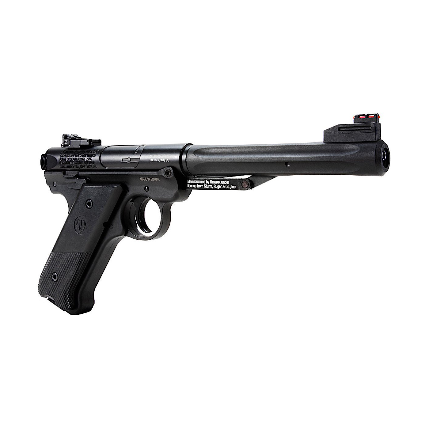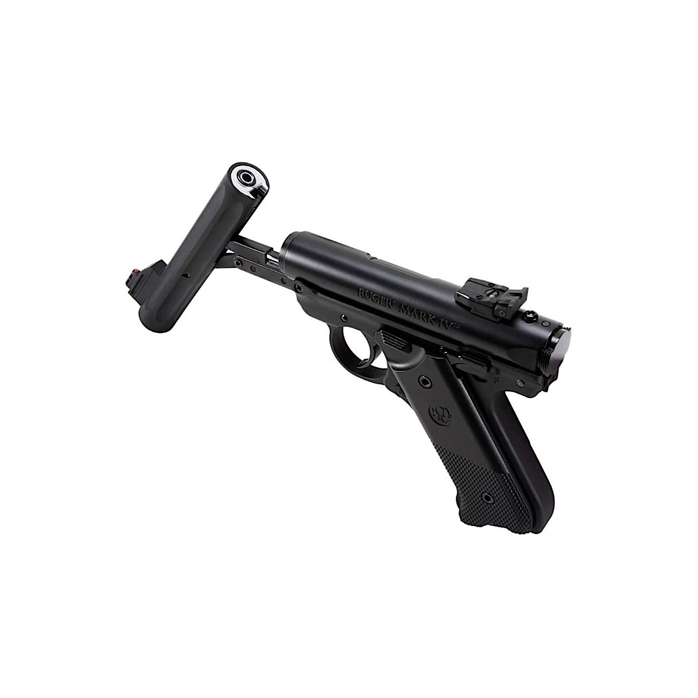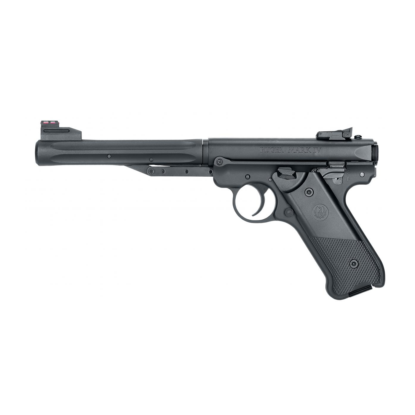 La Mark IV è una replica autentica dell'omonima pistola .22 di Ruger. Il sistema in metallo di alta qualità è decorato con i segni originali e, insieme al mirino in fibra ottica, gli conferisce l'aspetto autentico che i fan dell'iconica pistola a percussione anulare apprezzano così tanto.Invece di un caricatore da 10 colpi, la versione a molla si basa su un classico sistema di bascula della canna a colpo singolo. Il manicotto della canna in polimero testurizzato assicura un facile armamento, mentre la sicura automatica blocca il grilletto. In termini di precisione, la canna rigata in combinazione con la tacca di mira regolabile in altezza e deriva non lascia nulla a desiderare.