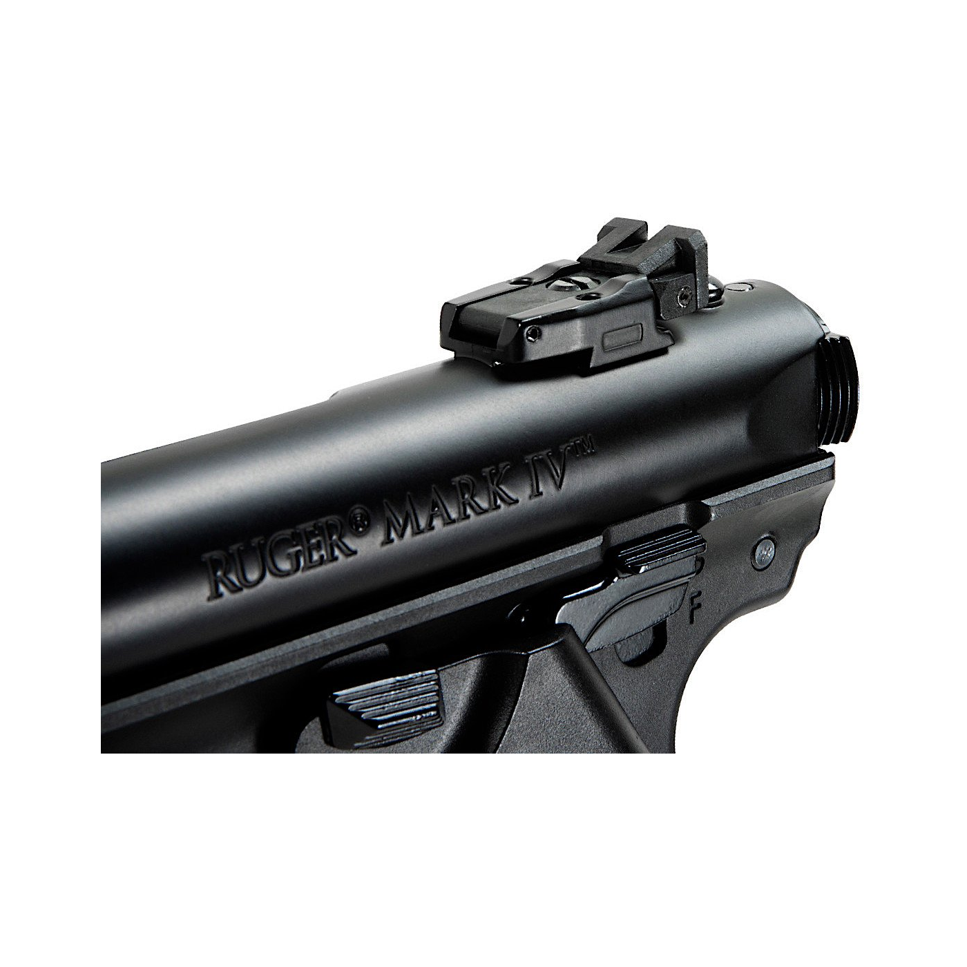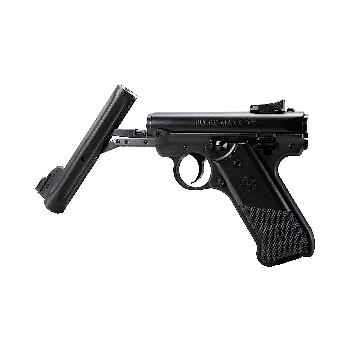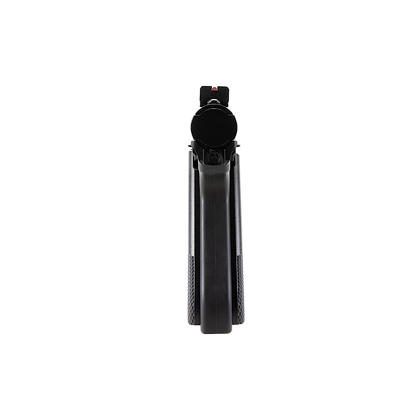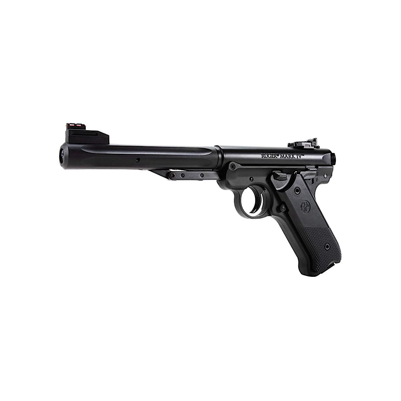 La Mark IV è una replica autentica dell'omonima pistola .22 di Ruger. Il sistema in metallo di alta qualità è decorato con i segni originali e, insieme al mirino in fibra ottica, gli conferisce l'aspetto autentico che i fan dell'iconica pistola a percussione anulare apprezzano così tanto.Invece di un caricatore da 10 colpi, la versione a molla si basa su un classico sistema di bascula della canna a colpo singolo. Il manicotto della canna in polimero testurizzato assicura un facile armamento, mentre la sicura automatica blocca il grilletto. In termini di precisione, la canna rigata in combinazione con la tacca di mira regolabile in altezza e deriva non lascia nulla a desiderare.