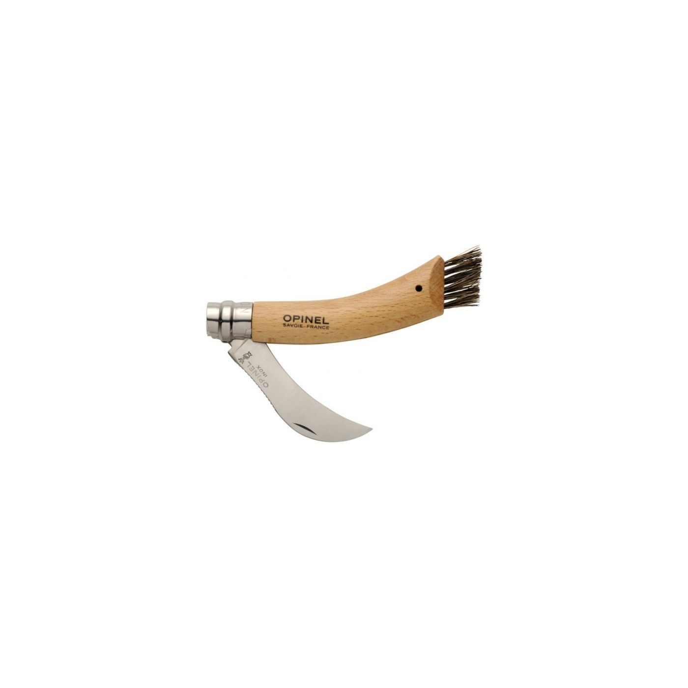 Opinel N°8 Mushroom possiede una spazzola con setole di cinghiale sul manico per rimuovere la terra presente sui funghi al momento del raccolto, la lama è curva e sottile con lato dentellato per togliere la cuticola.