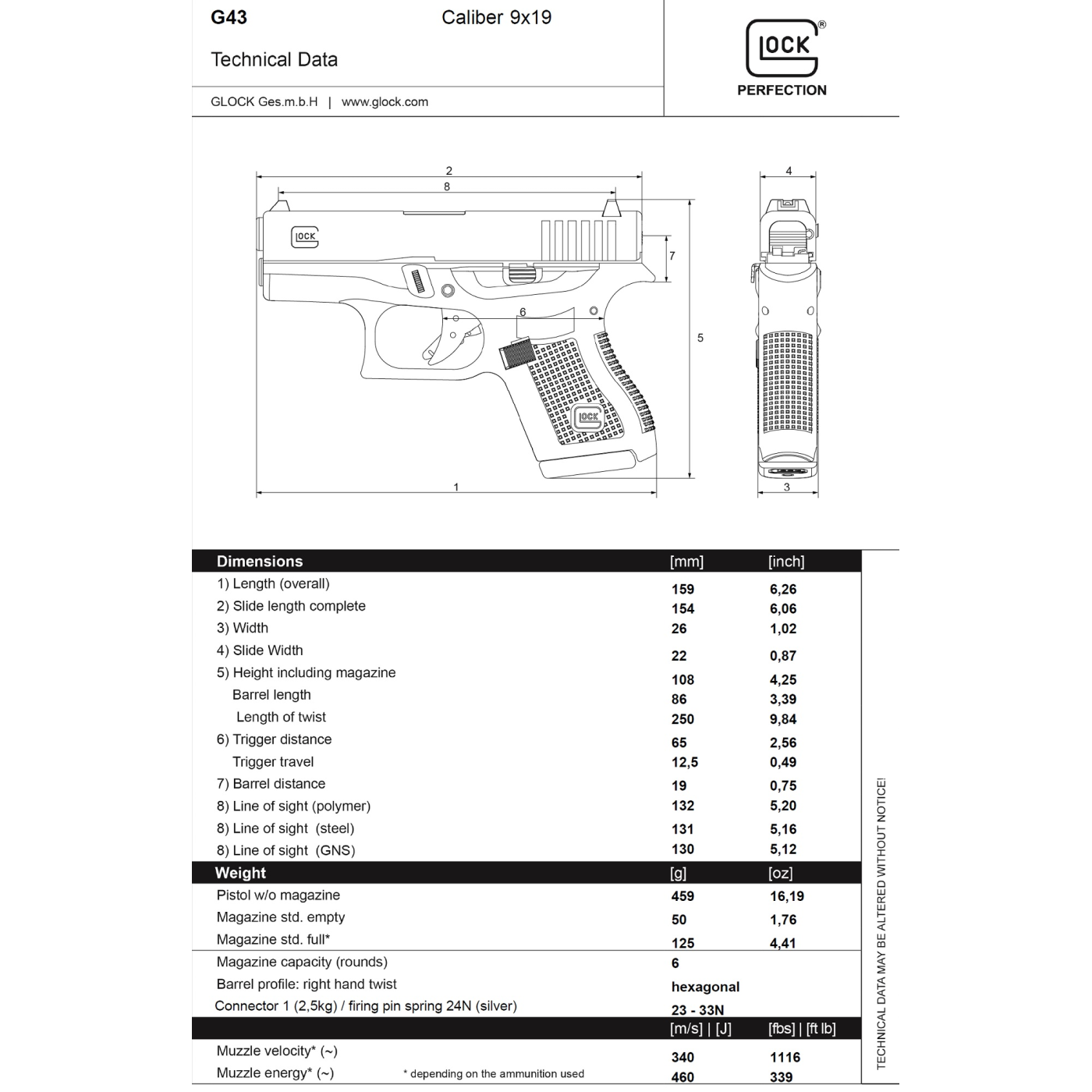 - Carrello in acciaio e fusto in polimero - Caricatore monofilare da 6 colpi - Lunghezza arma: 159 mm - Lunghezza canna: 86 mm - Altezza; 108 mm - Peso (a vuoto): 509g - Peso con caricatore: 634g - Scatto: 2,5 Kg