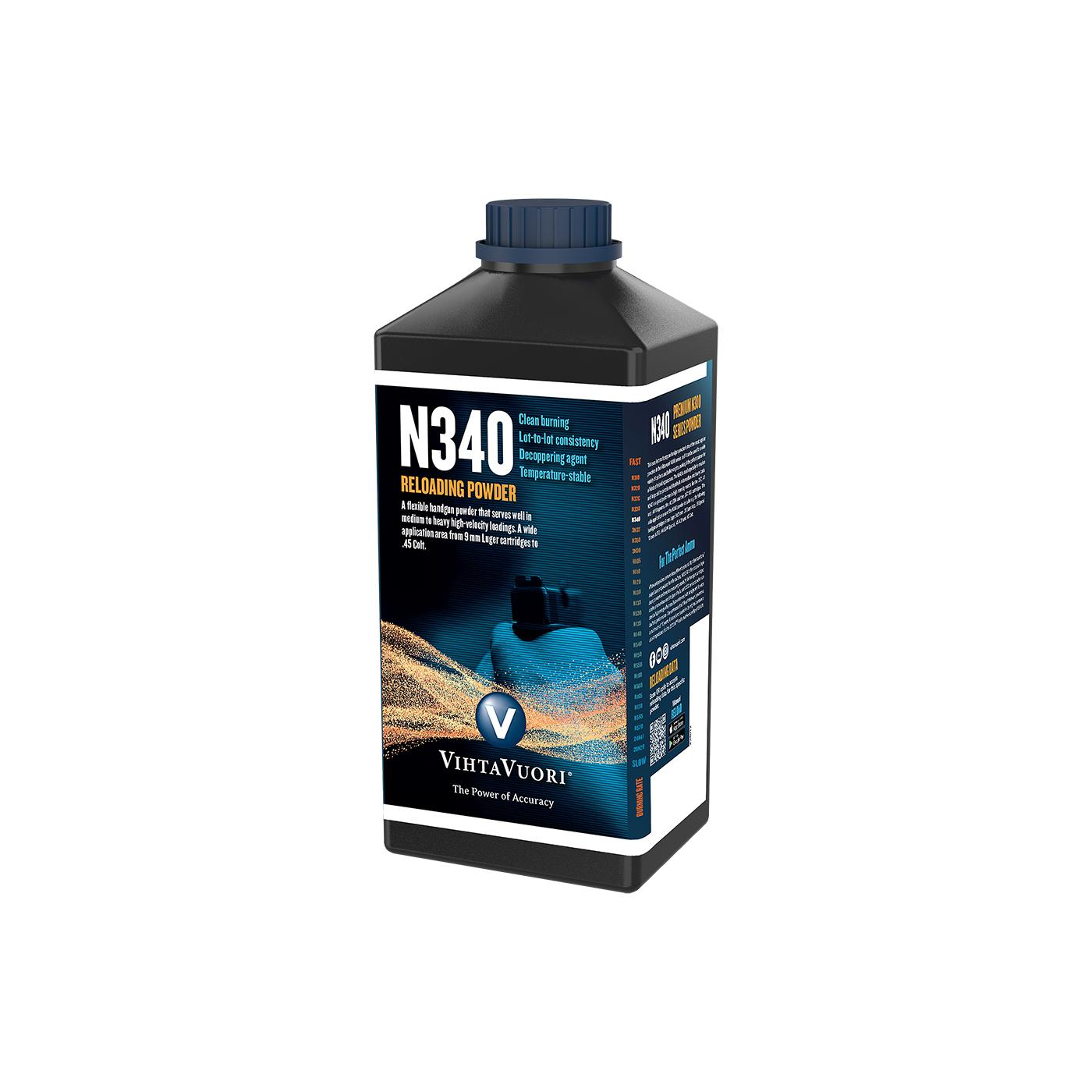 N340 è un tipo di polvere tubolare con granulometrie di 1,0 mm di lunghezza e 0,8 mm di diametro. Esattamente la stessa granulometria della polvere N320, N330 e N350 – cambia solo la porosità della polvere. La velocità di combustione dell'N340 è alla scala media delle polveri per pistole Vihtavuori - e come con la polvere N320, con N340 la combustione estremamente pulita e senza residui è garantita.