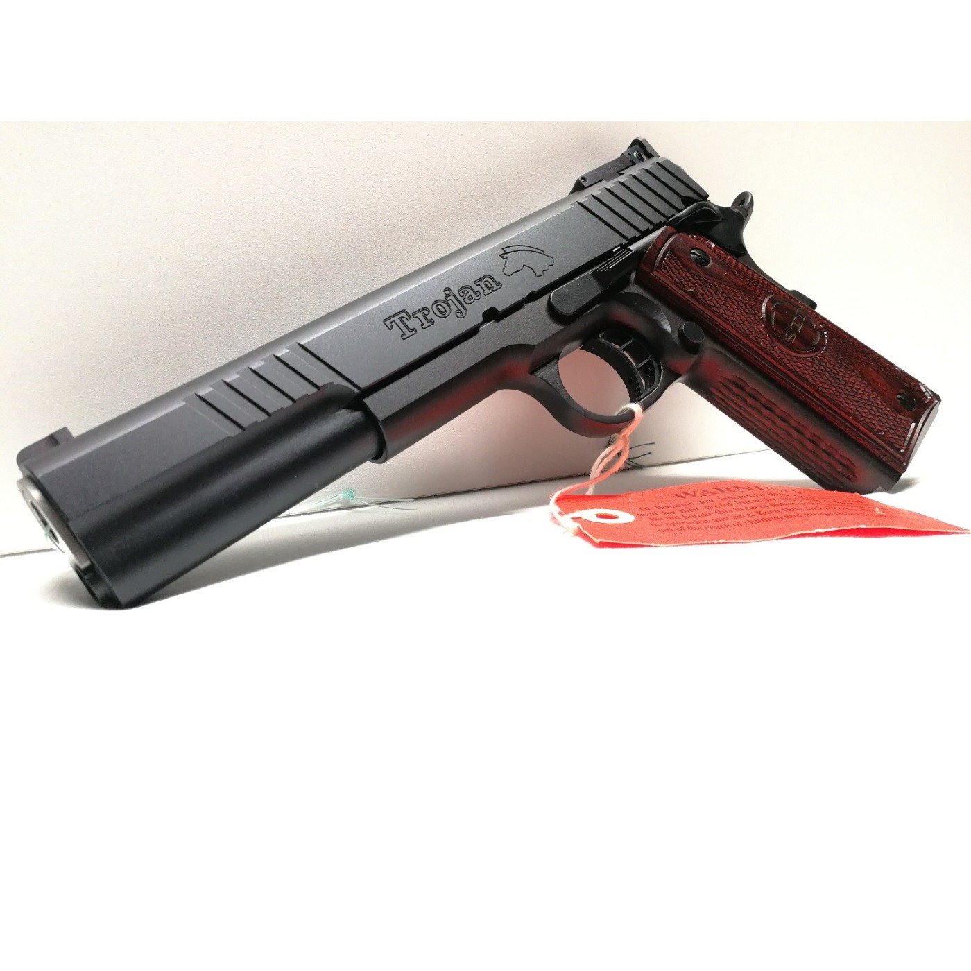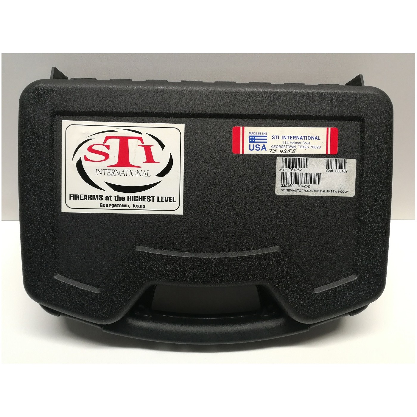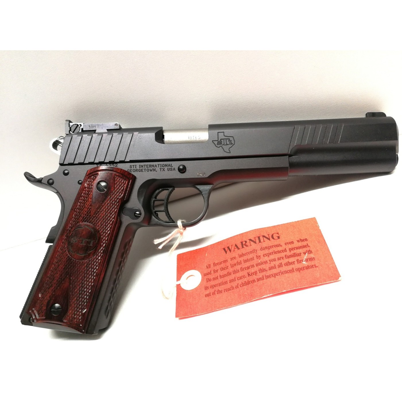 STI modello Trojan calibro 40SW. Funzionamento in singola azione (S/A) caricatore monofilare con capacità 8 Colpi. Lunghezza canna 6". Tacca di mira regolabile. La precisione è notevole determinata dalla tradizionale lavorazione della STI. La pistola diventa in breve tempo quasi un prolungamento del braccio. Scatto accuratizzato guancette in legno,grilletto alleggerito. Perfetta per un uso sportivo.
