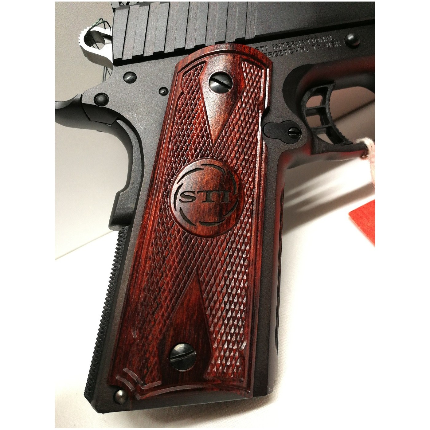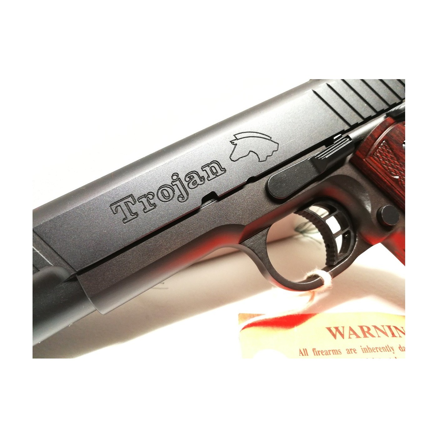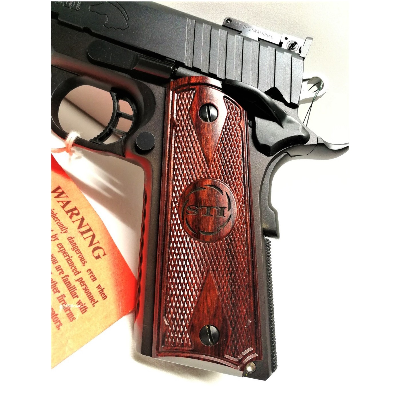 STI modello Trojan calibro 40SW. Funzionamento in singola azione (S/A) caricatore monofilare con capacità 8 Colpi. Lunghezza canna 6". Tacca di mira regolabile. La precisione è notevole determinata dalla tradizionale lavorazione della STI. La pistola diventa in breve tempo quasi un prolungamento del braccio. Scatto accuratizzato guancette in legno,grilletto alleggerito. Perfetta per un uso sportivo.