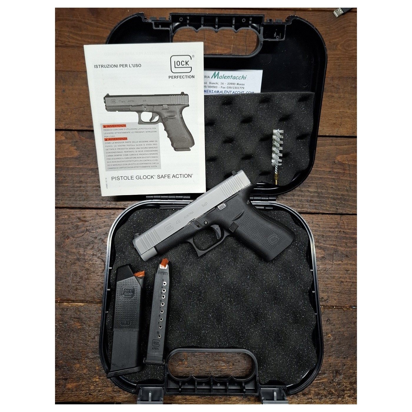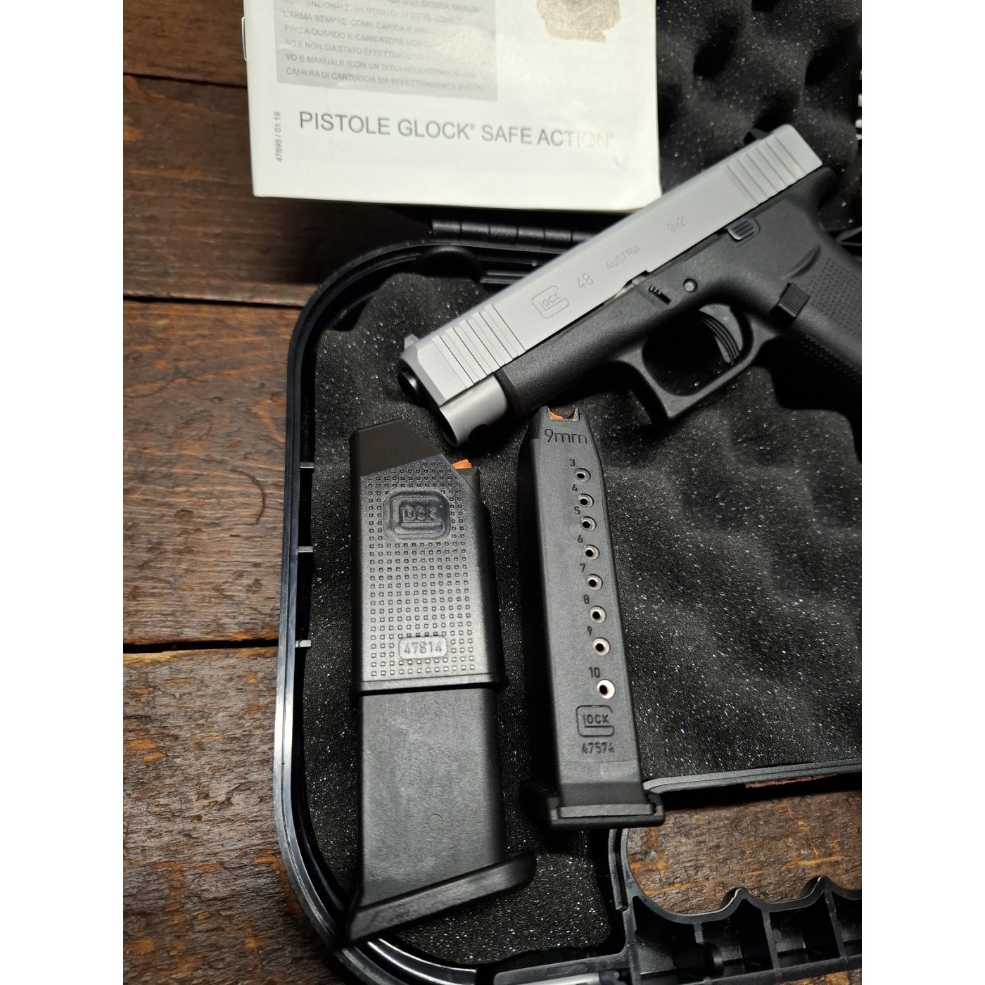 Glock modello 48 Silver, 2 caricatori monofilari da 10 colpi calibro 9x21canna 106 mmcarrello con finitura silver da 174 mmstesse dimensioni della Glock 19 ma con uno spessore di soli 24.5 mmsolo 712 grammi caricaideale per porto occulto da difesa personale